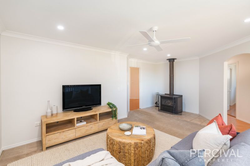 Freshly painted, TWO living areas offer separation with the lounge enjoying the ambience of a slow combustion wood fire, and the light filled family room having direct access to the north facing covered entertaining patio at rear.