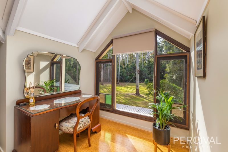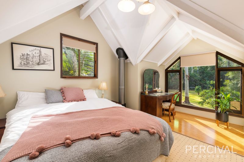 Upstairs each of the cottage bedrooms offers a charm of its own with generous deck taking in a spectacular treed outlook and cathedral style windows framing a stunning view across a sweeping glade to stands of Ironbark and River Red Gum.