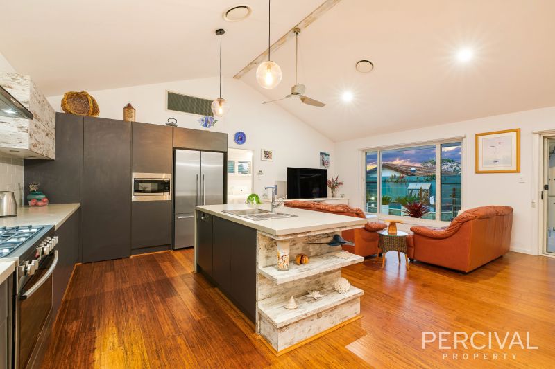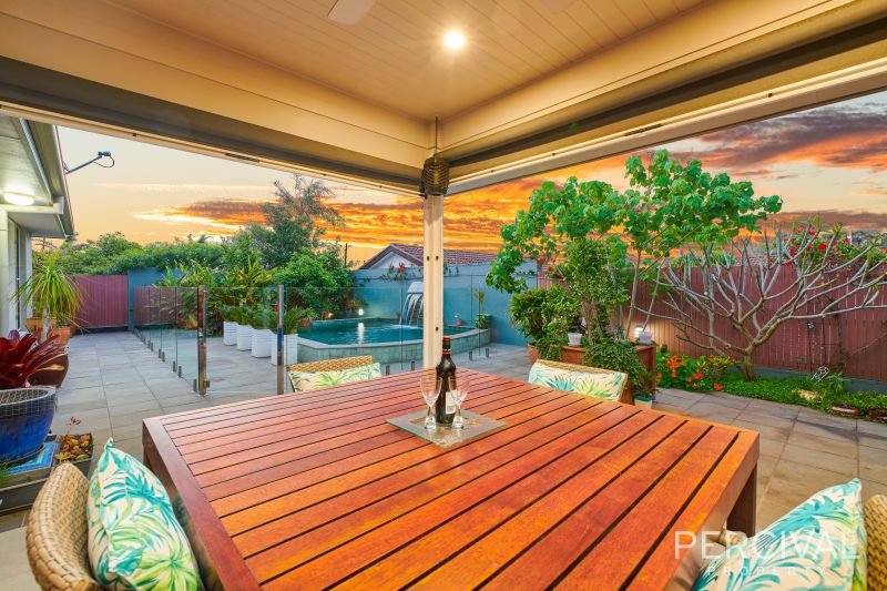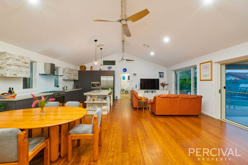 The open plan living and custom kitchen are generous and superbly appointed, sharing views of an expansive entertaining patio and fully tiled, infinity edge in ground pool with water feature. Whether cooking for a few or catering for a crowd, the designer kitchen with island benchtop, 900mm gas cooktop/electric oven and abundant storage is perfectly situated for ease of access whether dining indoors or alfresco.