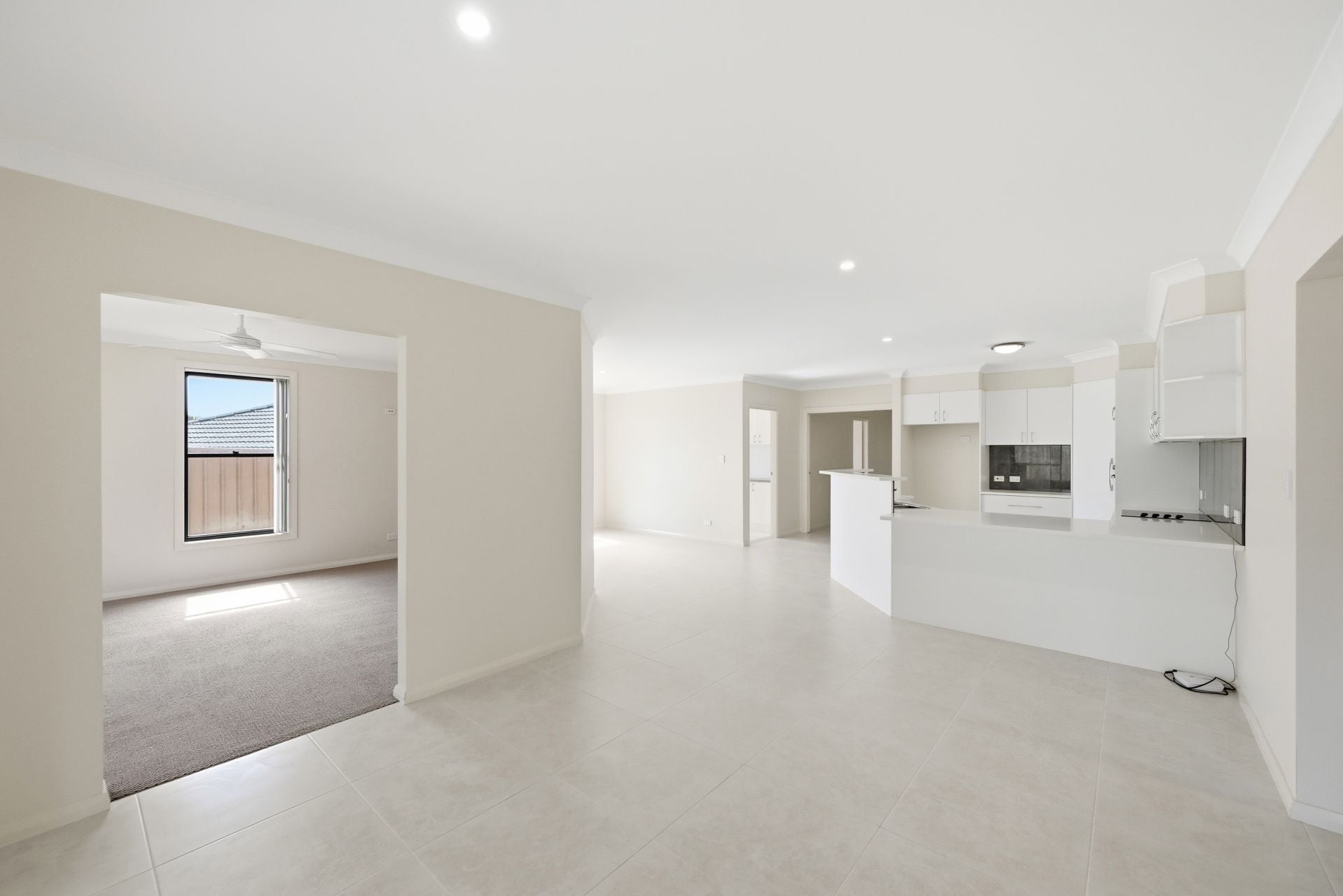 - Living area with ceiling fan