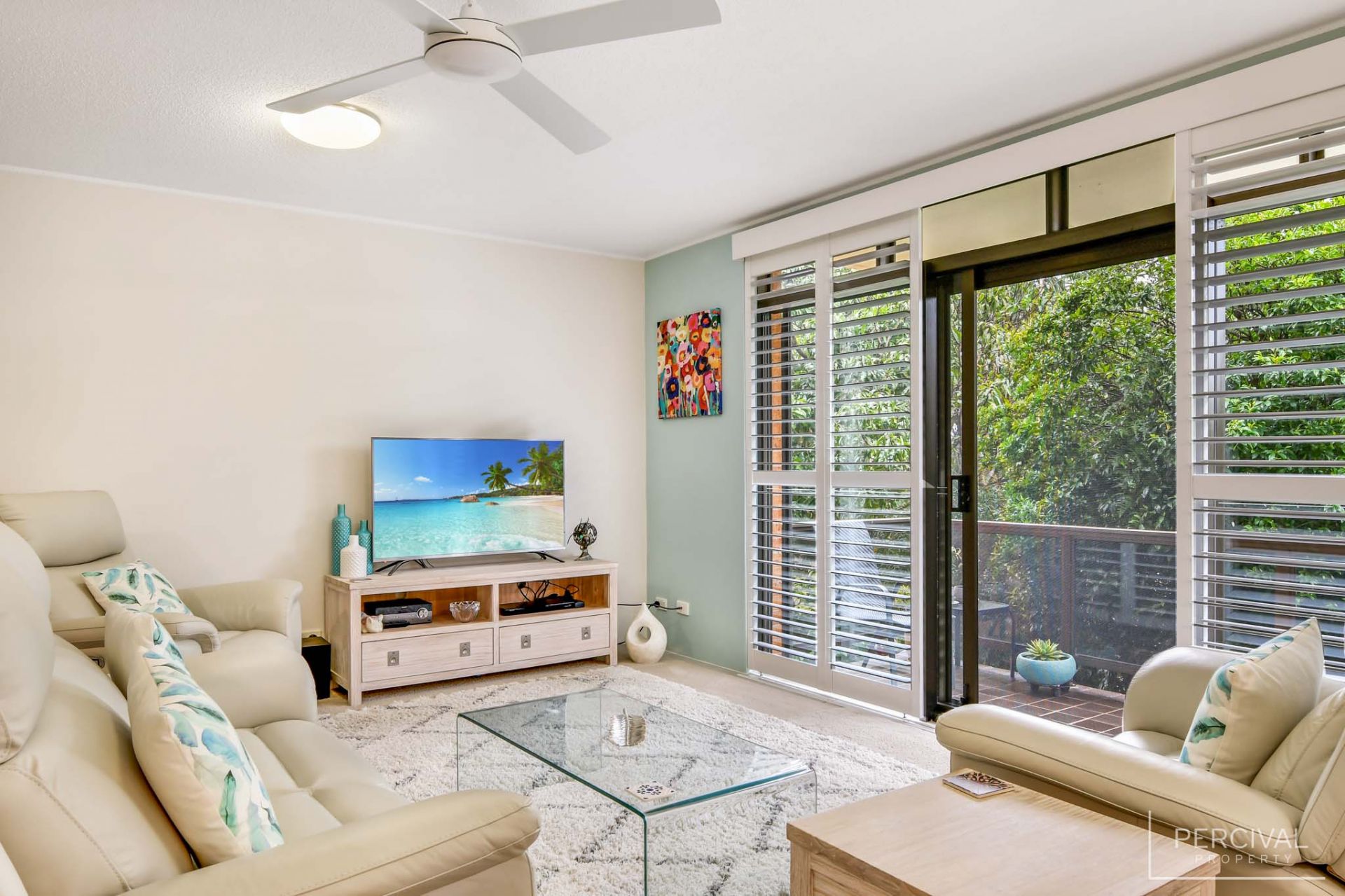- Open plan living/dining with ceiling fan opening to covered balcony