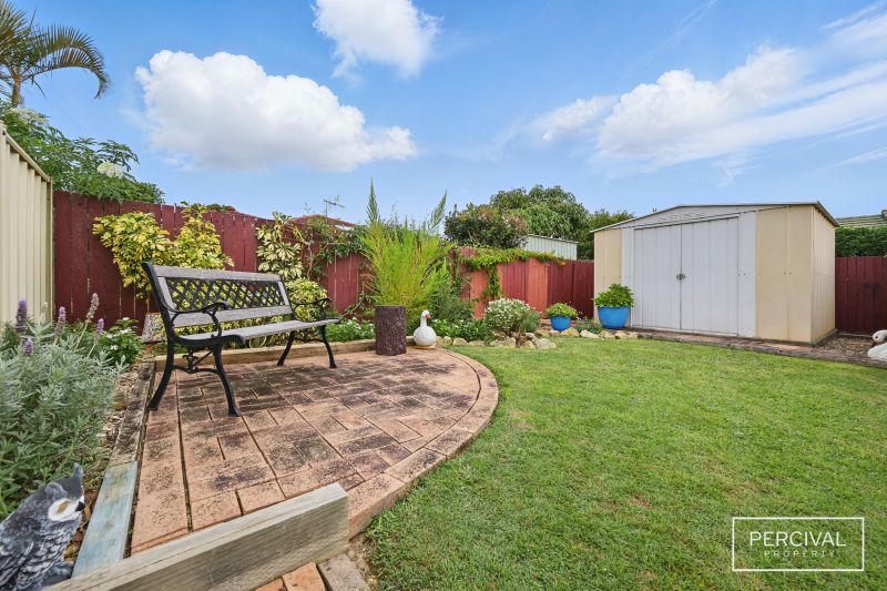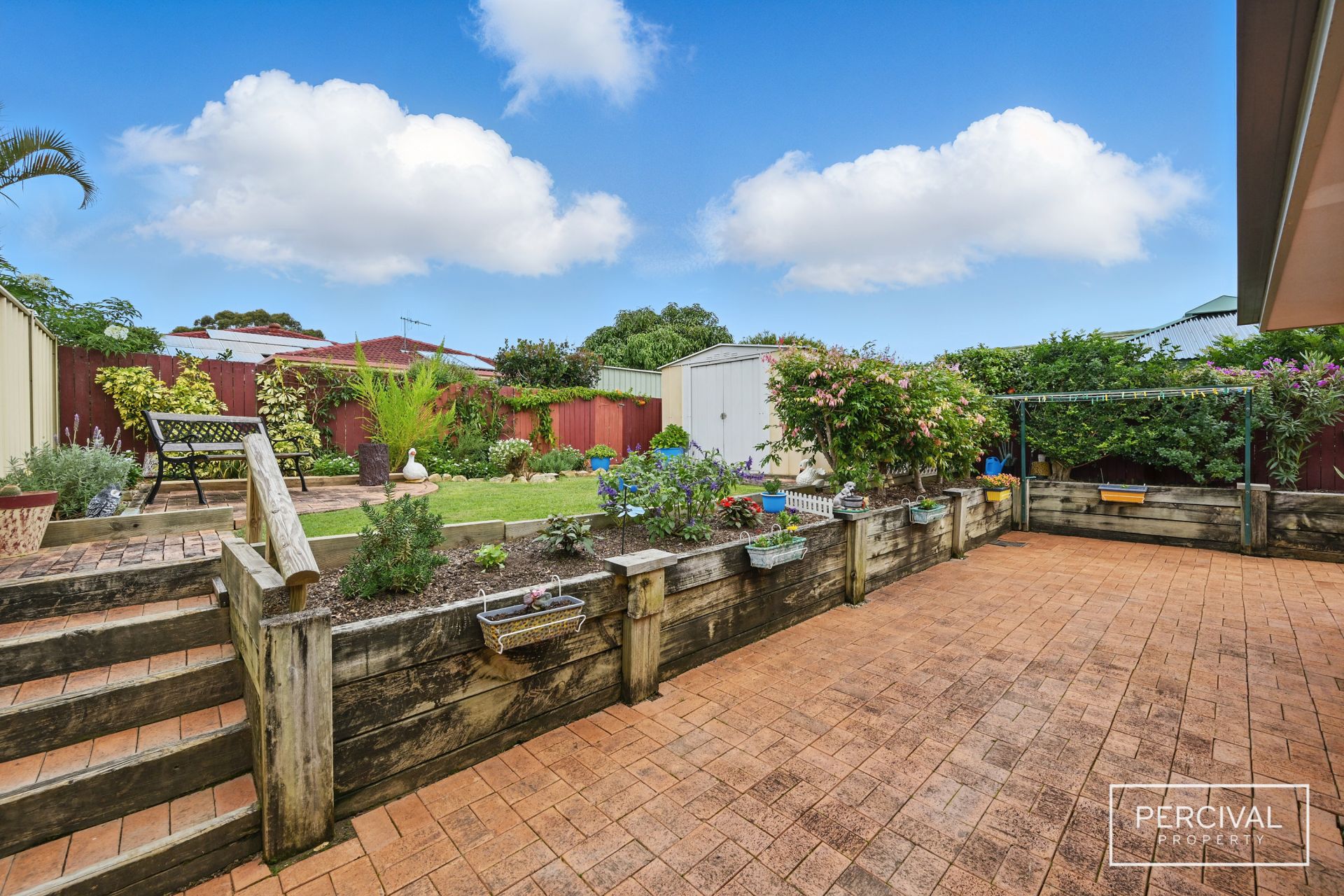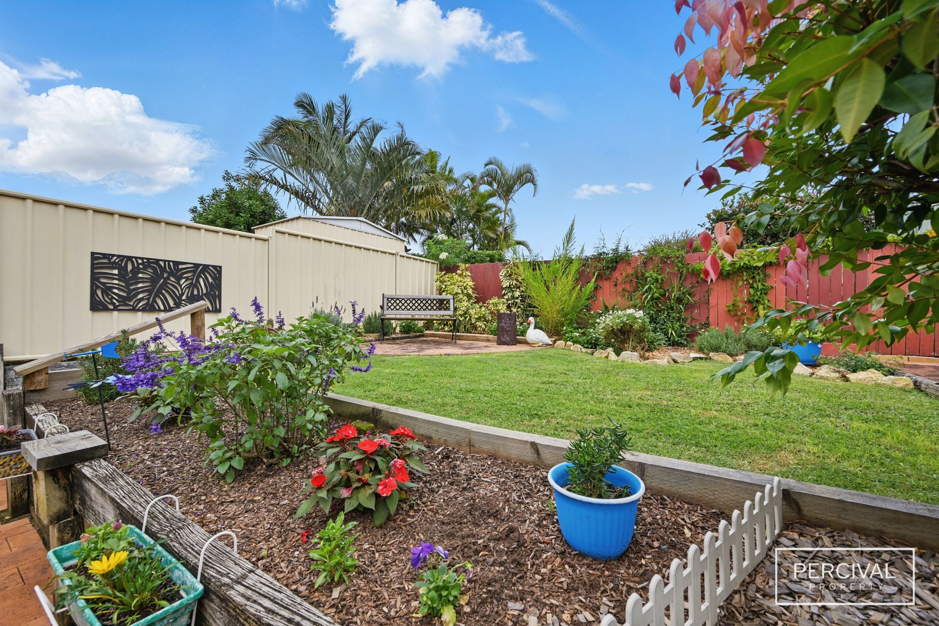 - Fully fenced yard with manicured gardens and garden shed