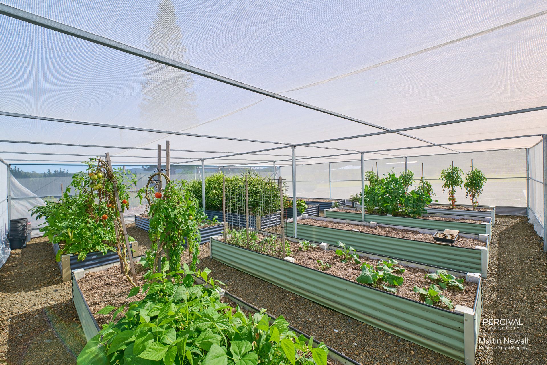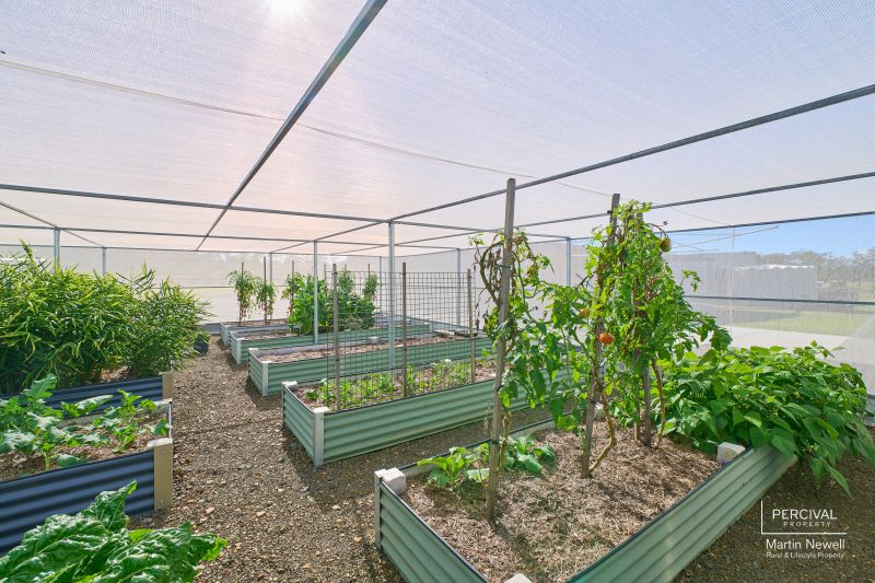 For those with a green thumb, a fully enclosed raised bed vegetable garden ensures year-round produce. The property exudes pristine condition, with the northern section resembling a meticulously maintained park or golf course.