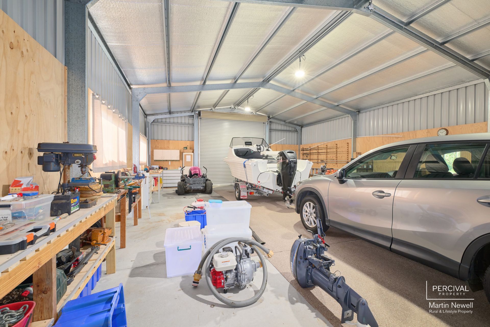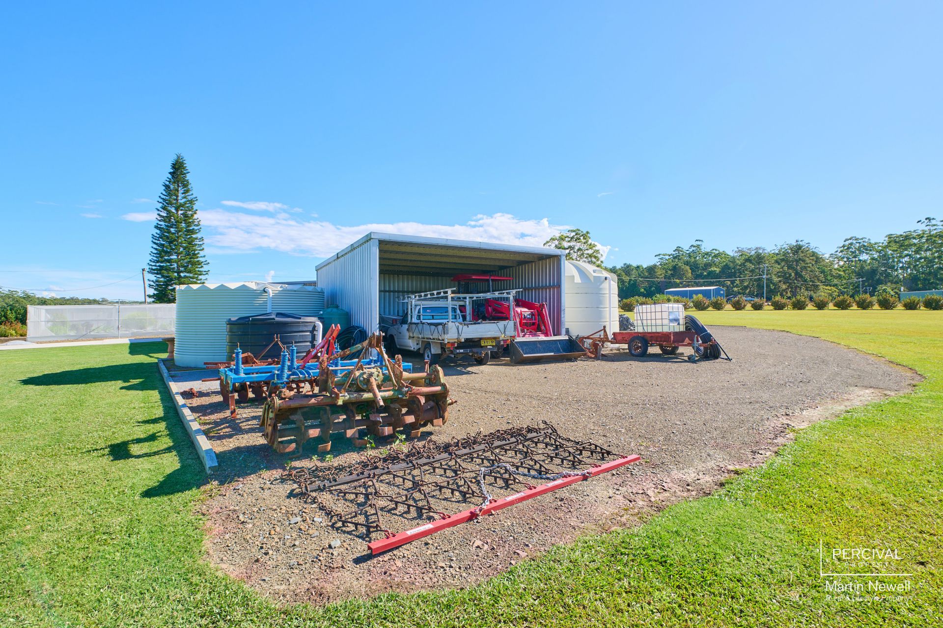 Adjacent to the homestead stands a generously sized shed featuring self-contained accommodation, including a kitchen and a spacious open-plan area (5.6m x 8.6m), along with a bathroom, separate toilet, and storage room. The fully enclosed shed offers ample garaging and workshop space (8.7m x 12.3m), with an additional north-facing machinery shed perfect for housing farming implements and equipment.