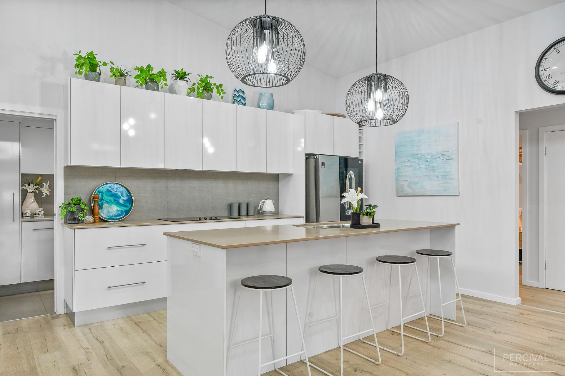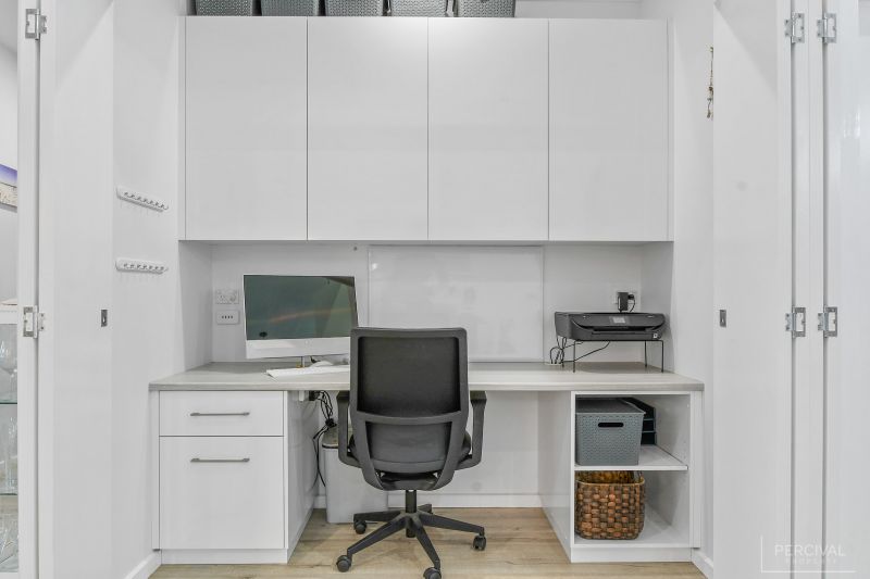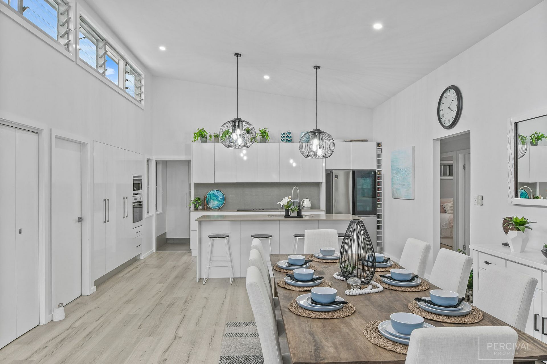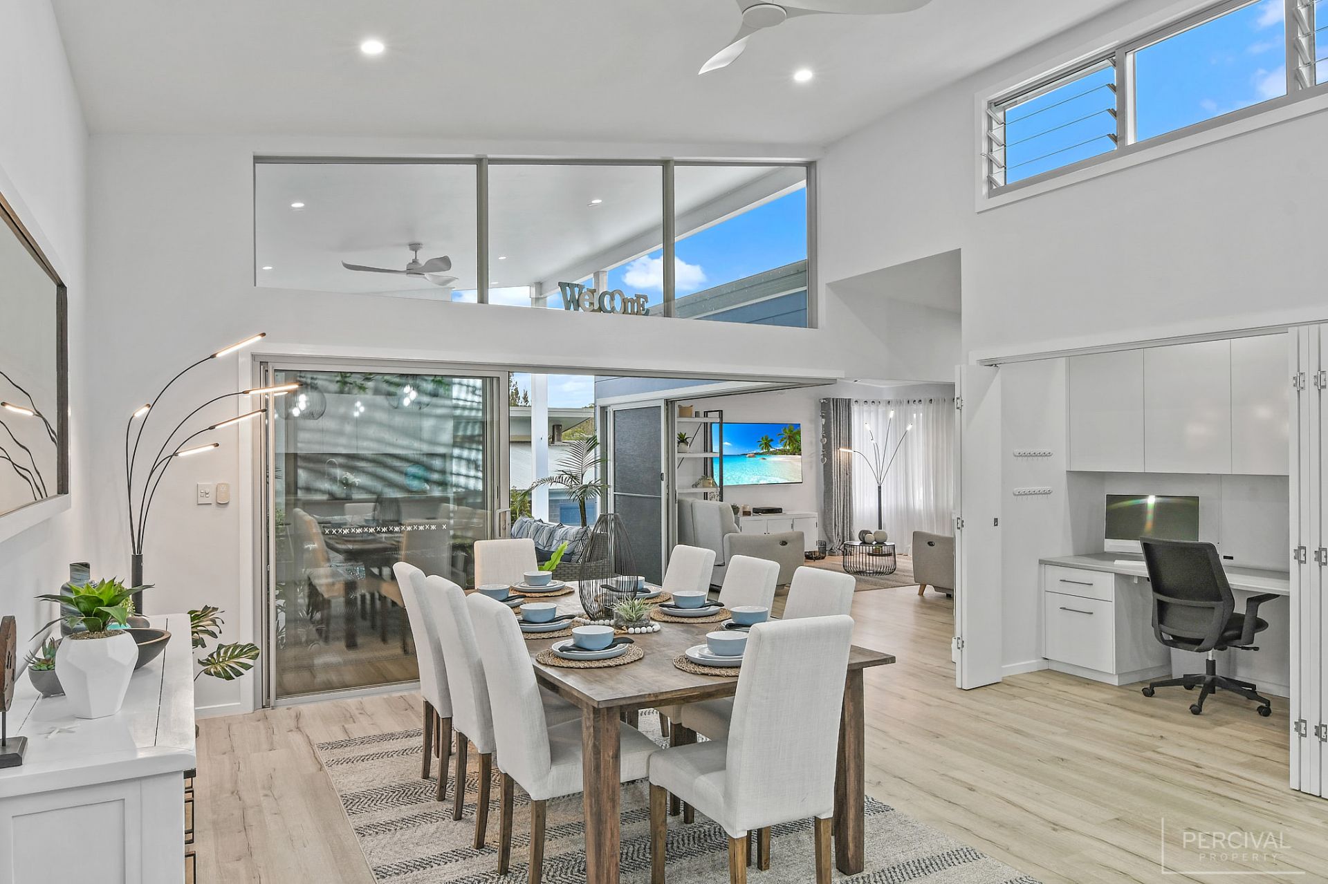 Raked ceilings, clerestory windows and a palette of white set against floating flooring in muted tones create an almost ethereal space incorporating a sleek stone kitchen with a wall of pantry storage, pendant lighting, and large home office with bi-fold doors.