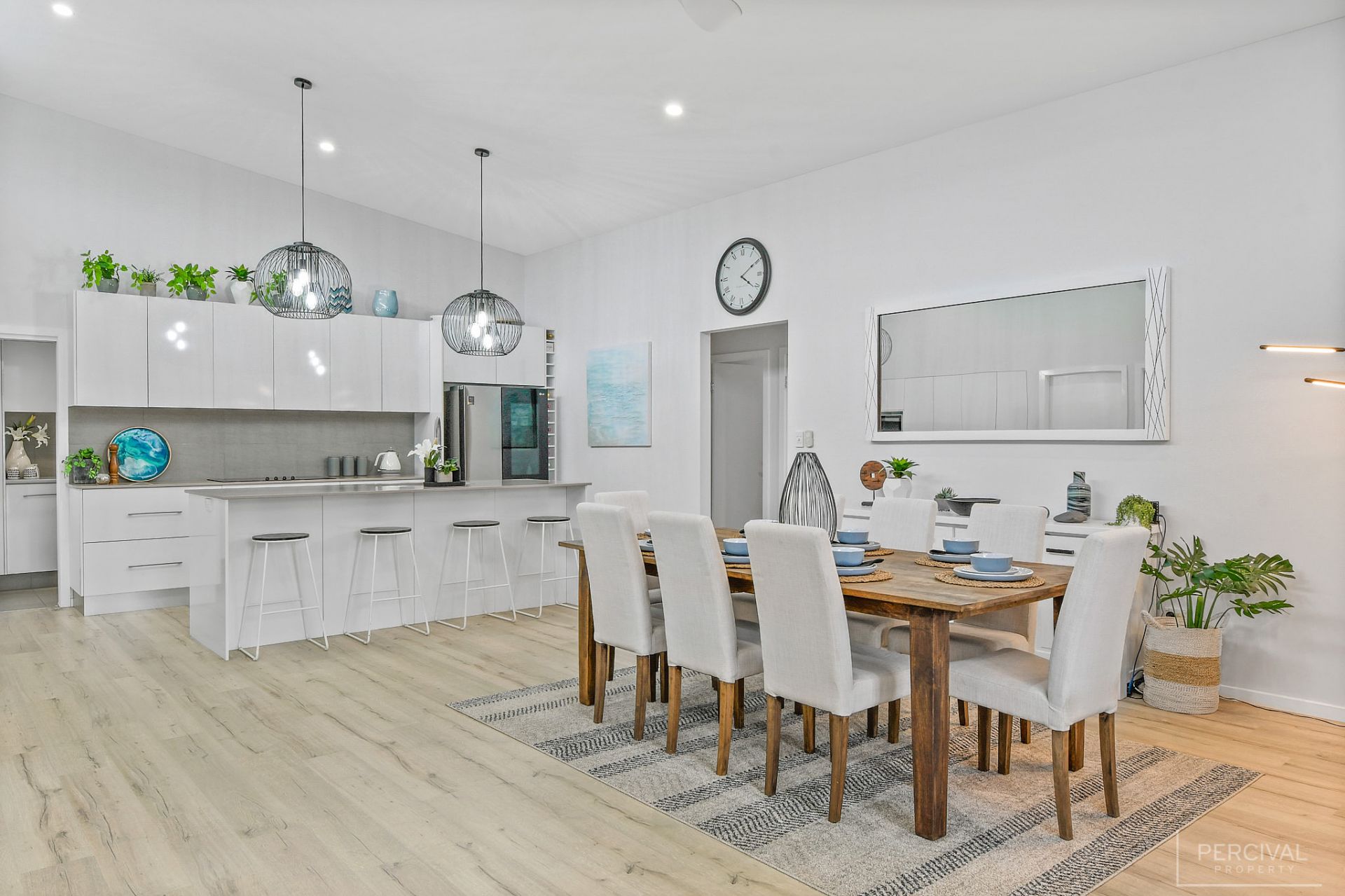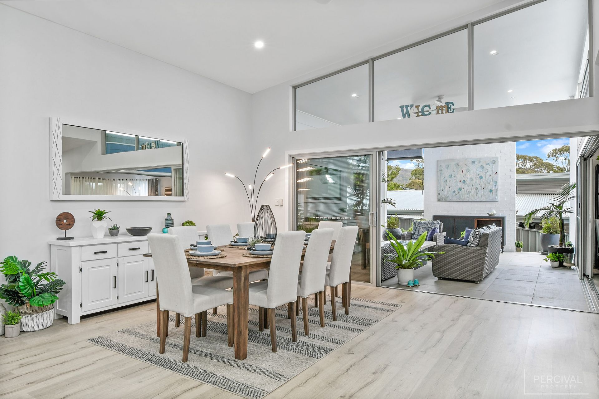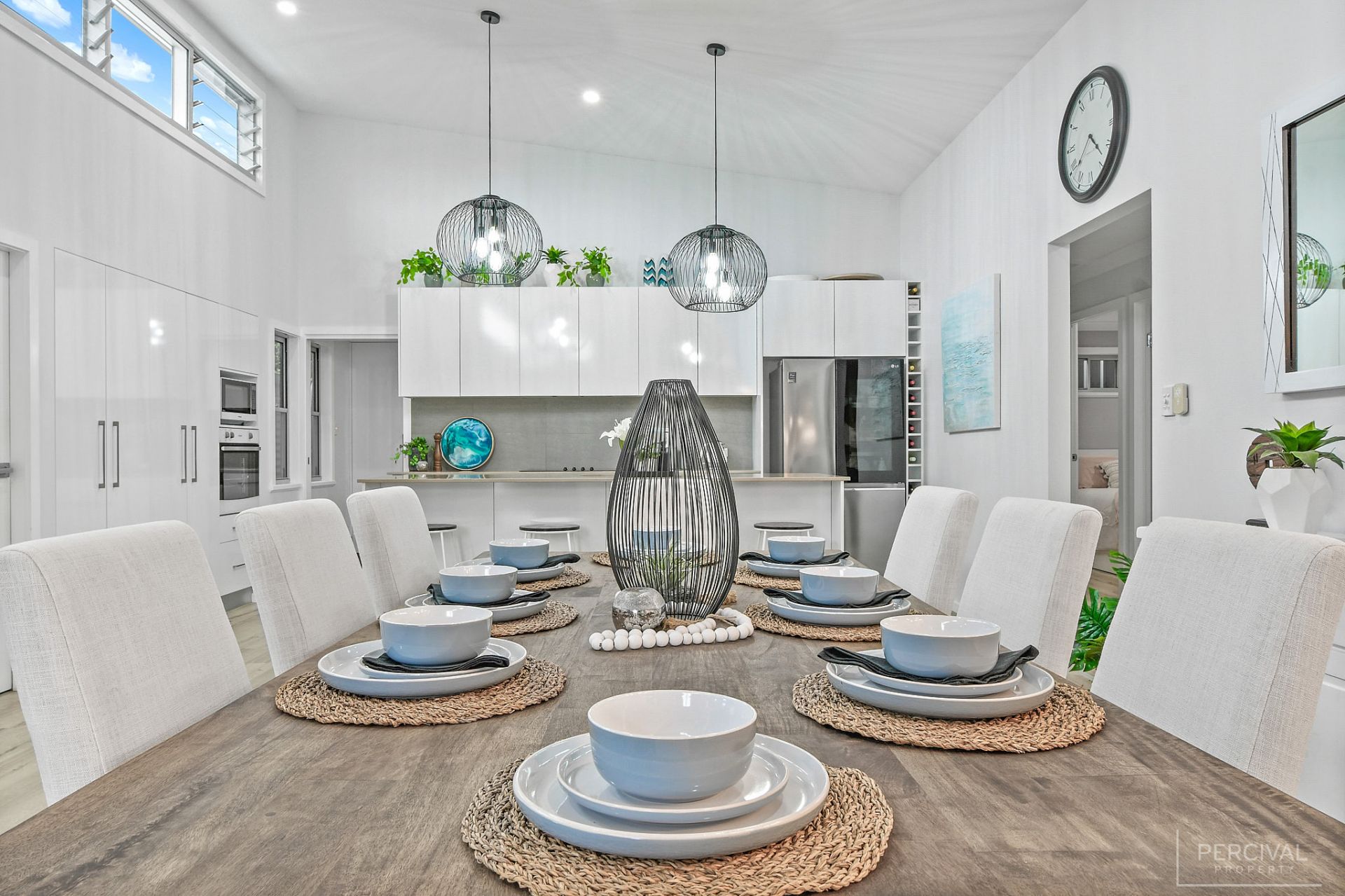 Raked ceilings, clerestory windows and a palette of white set against floating flooring in muted tones create an almost ethereal space incorporating a sleek stone kitchen with a wall of pantry storage, pendant lighting, and large home office with bi-fold doors.