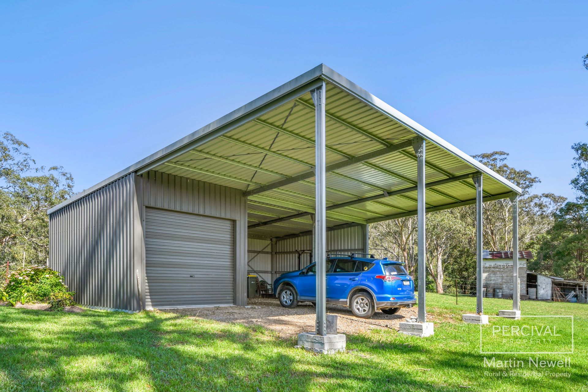 A modern machinery shed accommodates up to six vehicles, including a garage bay ideal for a workshop.