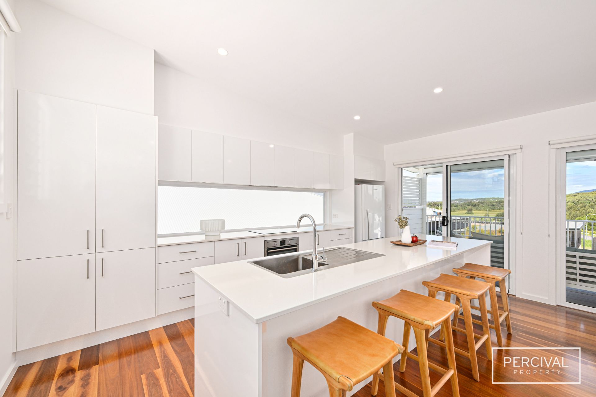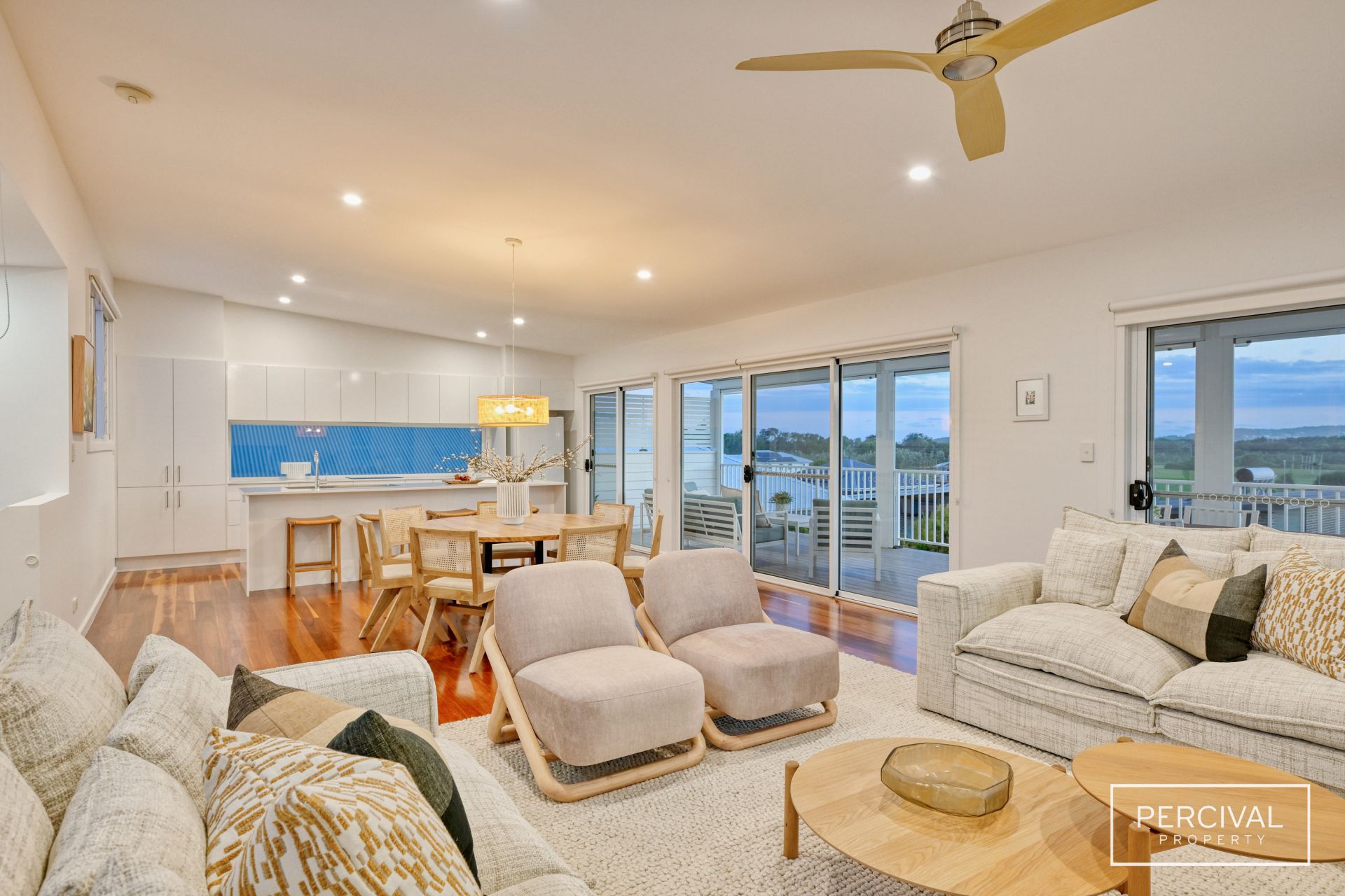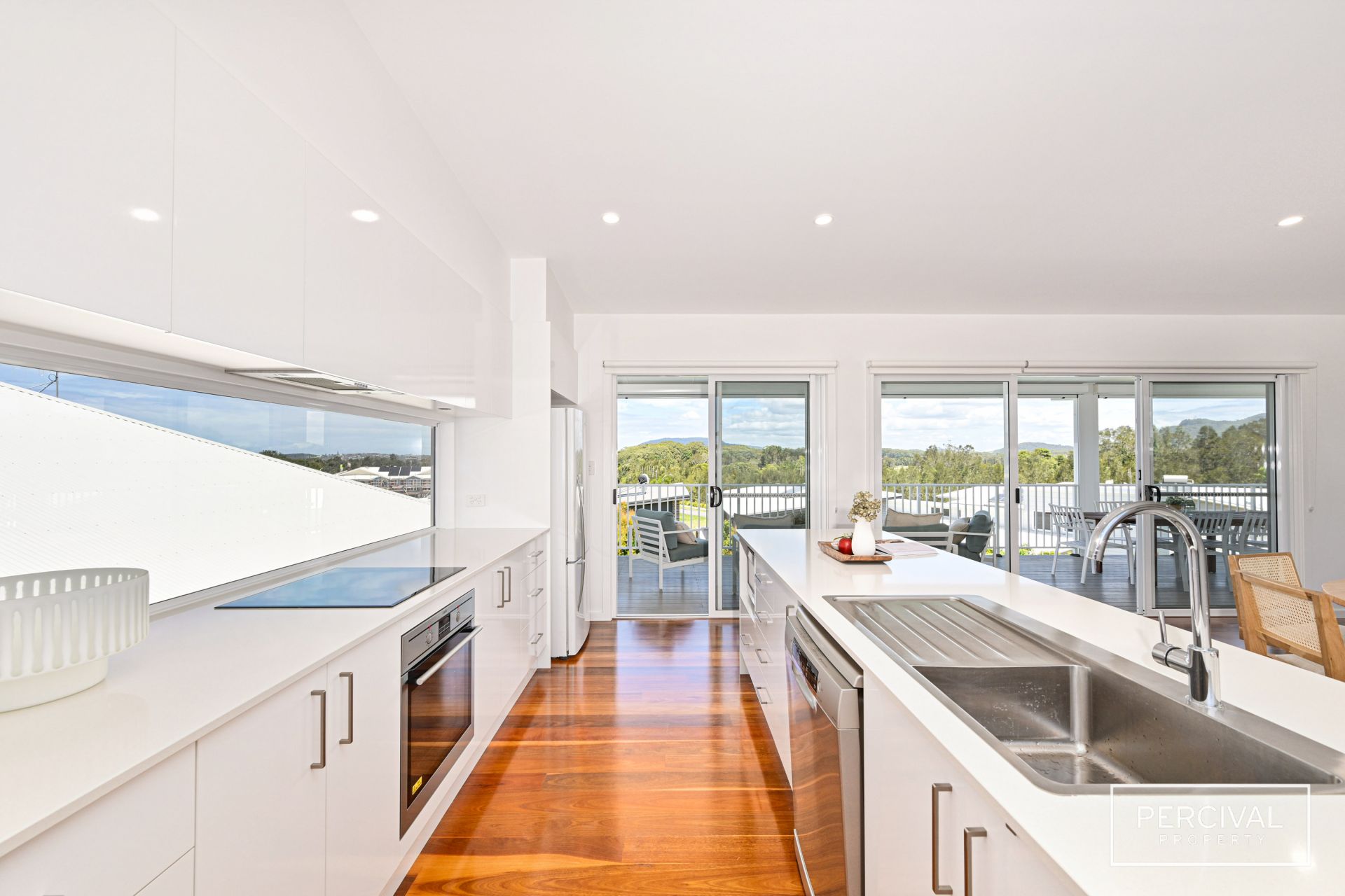 The sleek contemporary kitchen is designed for both style and function, featuring stone benchtops, an induction cooktop, dishwasher, and abundant storage. A natural rattan feature pendant defines the dining zone, while expansive glass sliders extend the living space onto a wide covered ModWood entertaining deck.