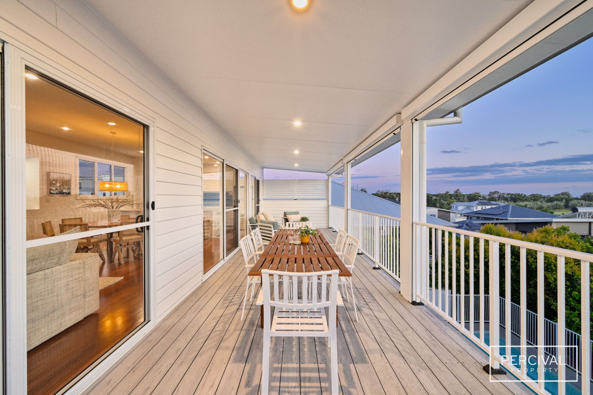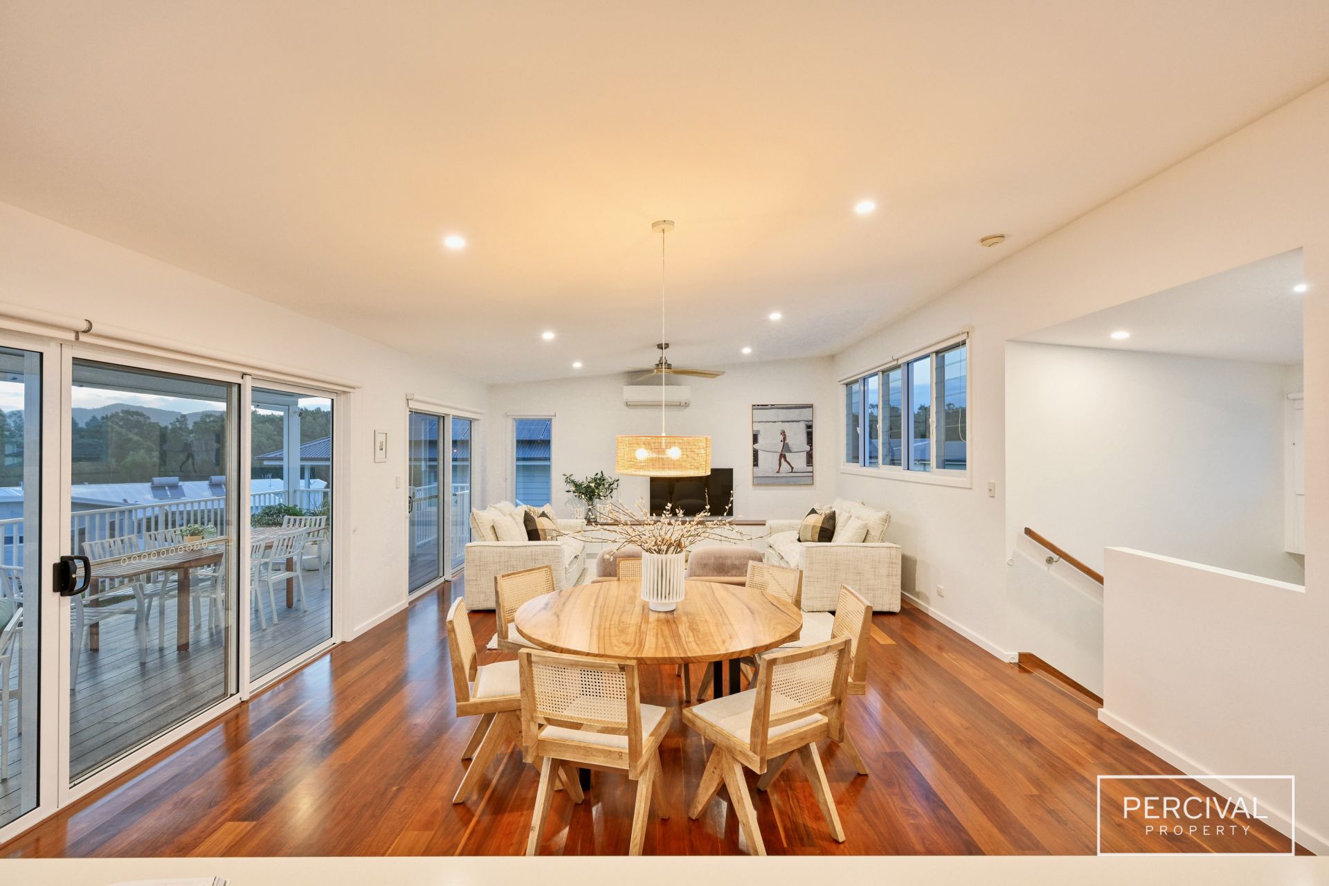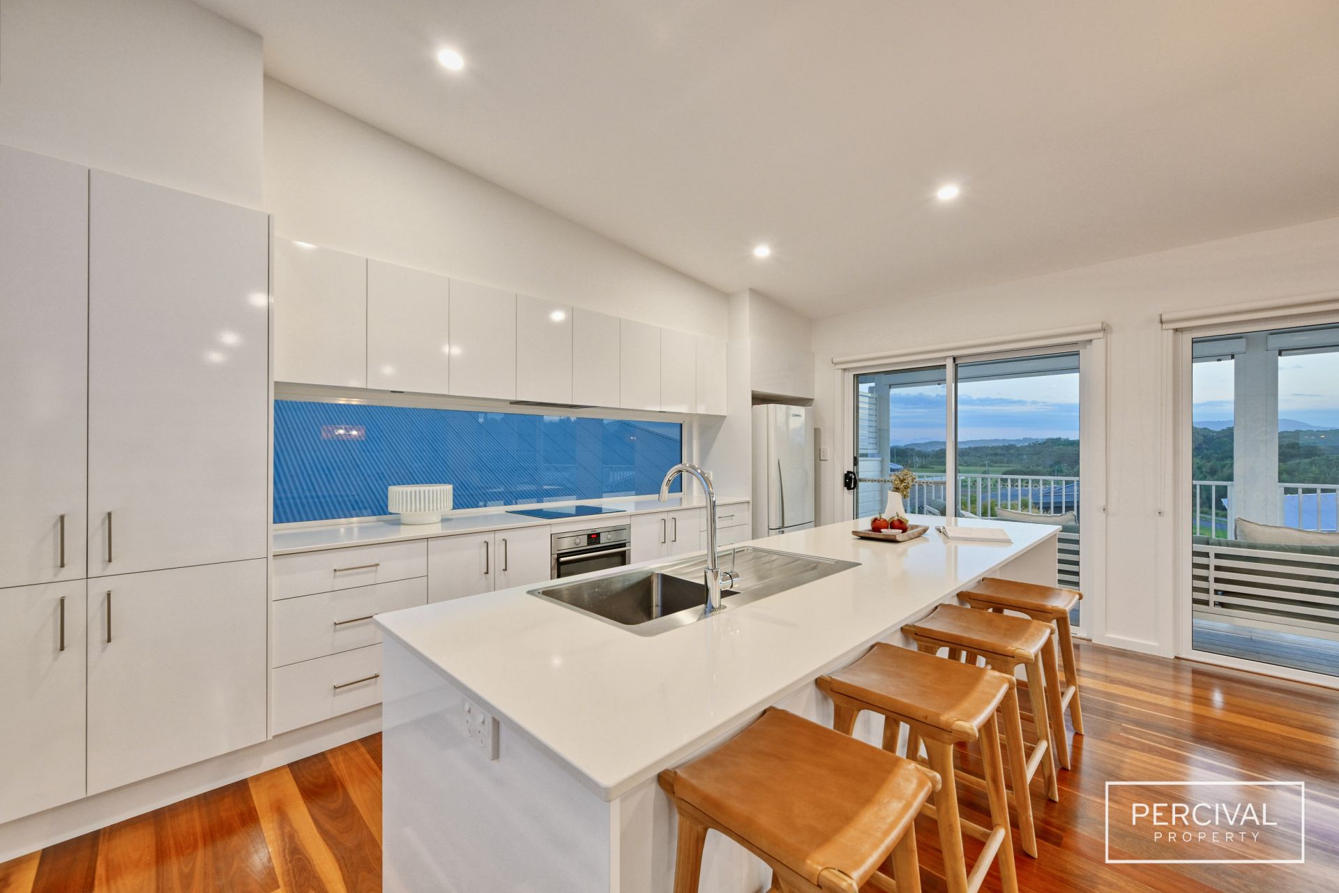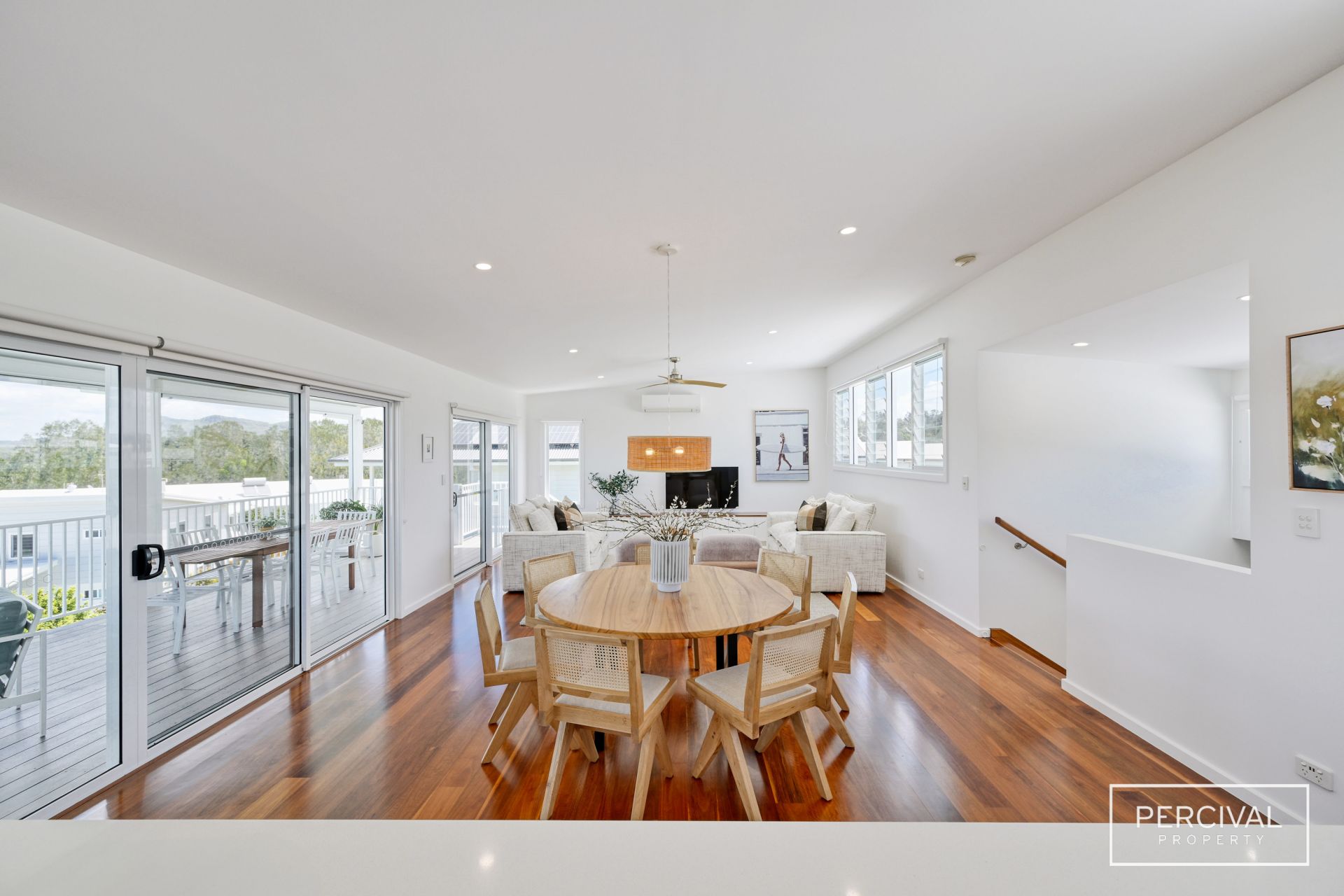 The sleek contemporary kitchen is designed for both style and function, featuring stone benchtops, an induction cooktop, dishwasher, and abundant storage. A natural rattan feature pendant defines the dining zone, while expansive glass sliders extend the living space onto a wide covered ModWood entertaining deck.