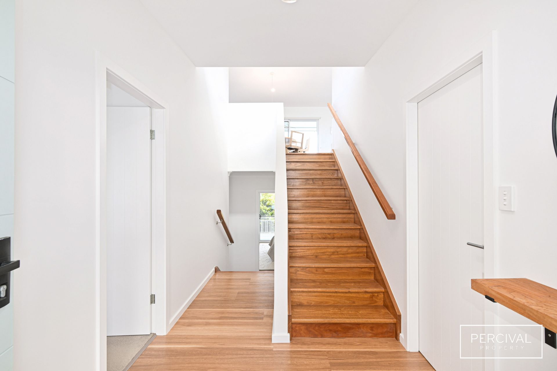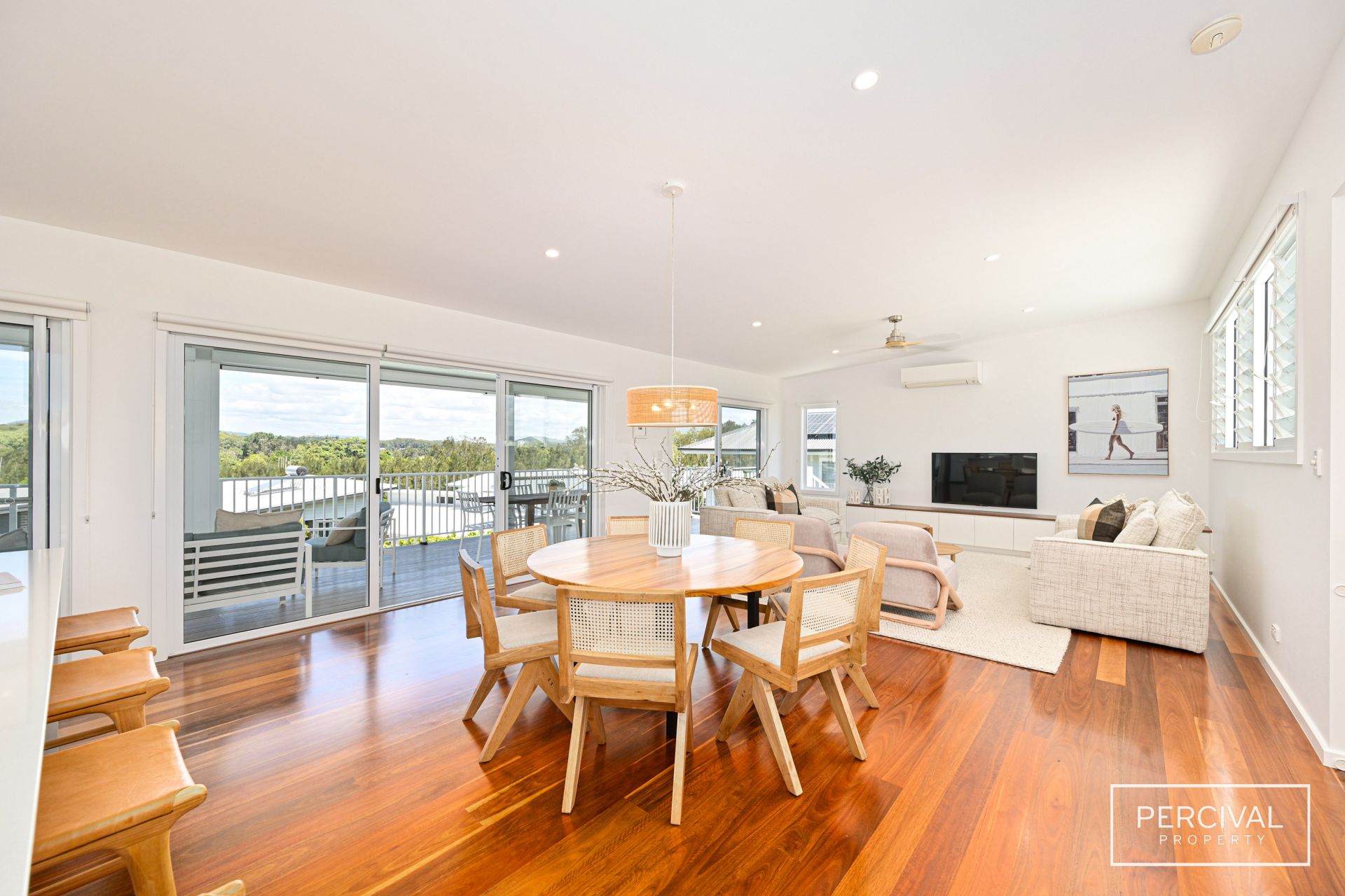 The open-plan living, dining, kitchen, and alfresco spaces create a seamless flow on the upper level, where spotted gum hardwood flooring and high raked ceilings enhance the home's airy coastal aesthetic. A custom entertainment unit with a spotted gum top adds both style and practicality to the living area, complementing the home's warm natural finishes.