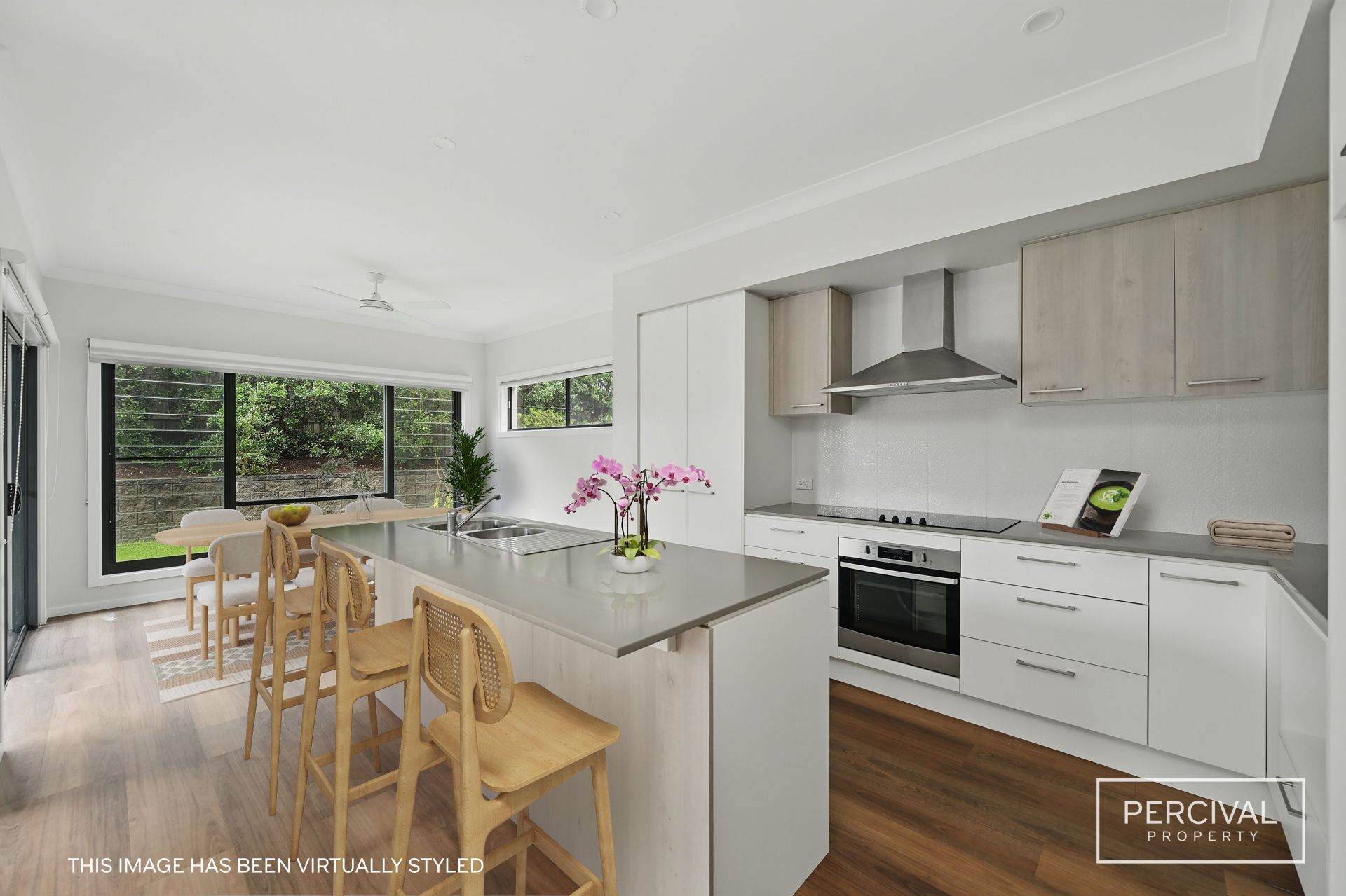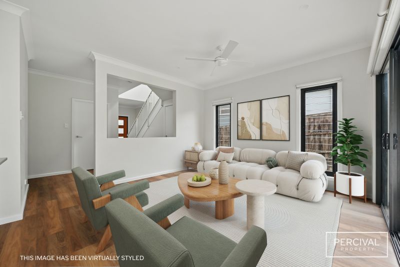The stylish kitchen is equipped with stone benchtops, quality appliances and streamlined cabinetry, forming a practical and welcoming space for everyday life. A powder room adds convenience on this level.