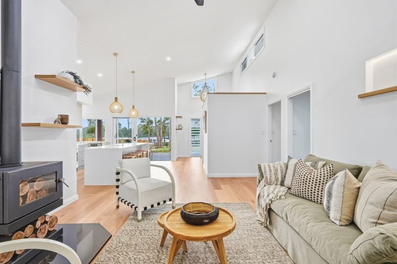 Step indoors to soaring raked ceilings and the warmth of engineered Blackbutt floors. Clerestory windows draw in light, while the north-facing aspect captures coastal breezes.