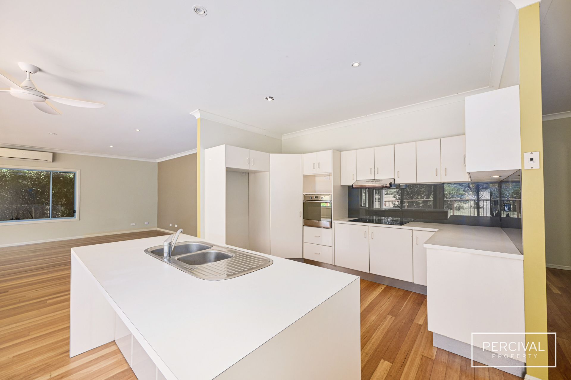 The heart of the home is a modern kitchen, equipped with electric cooking, ample storage, and a dishwasher, ideally positioned to serve both indoor and outdoor living spaces. A solar system and water tank enhance the property's eco-friendly credentials.