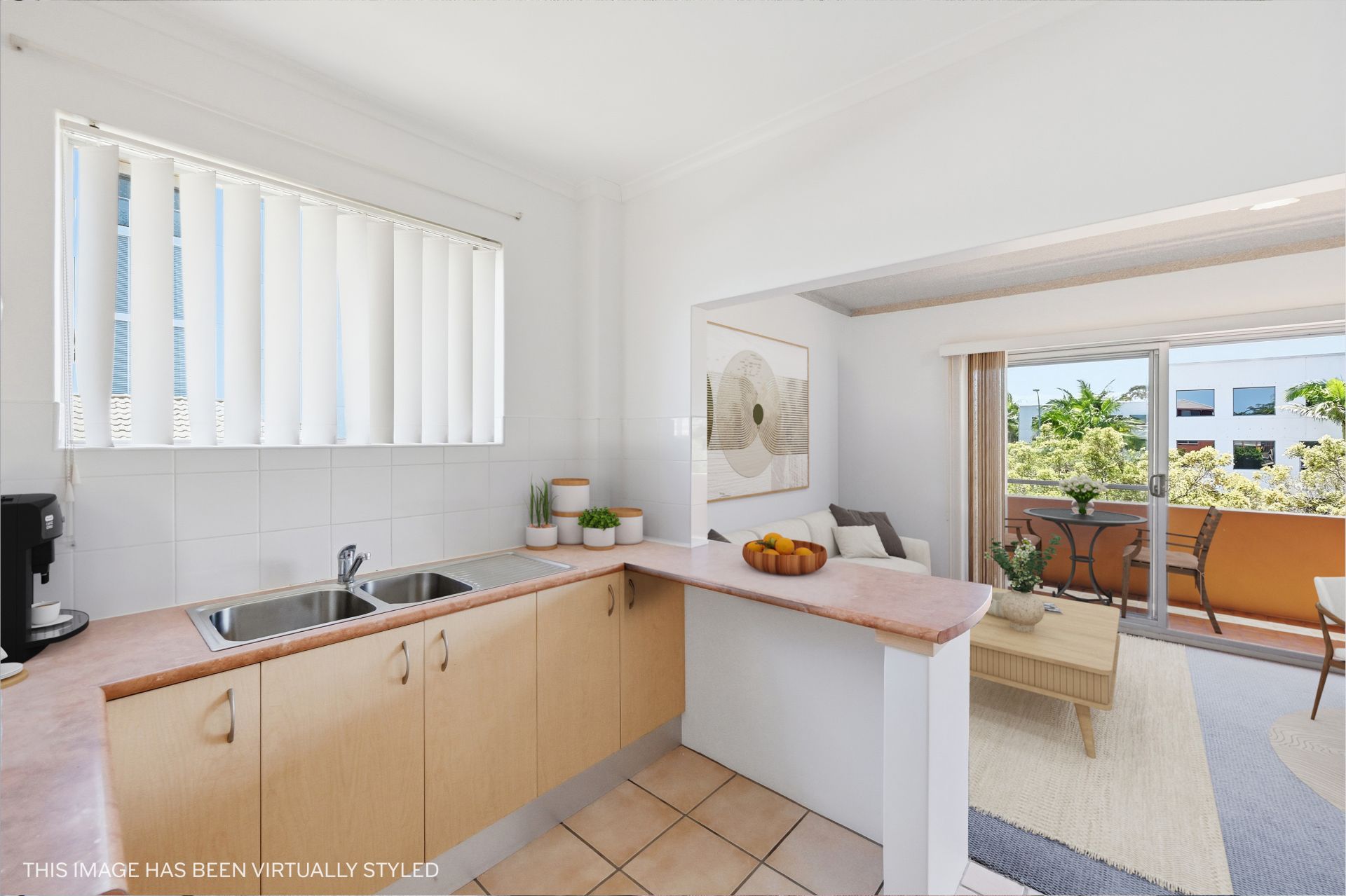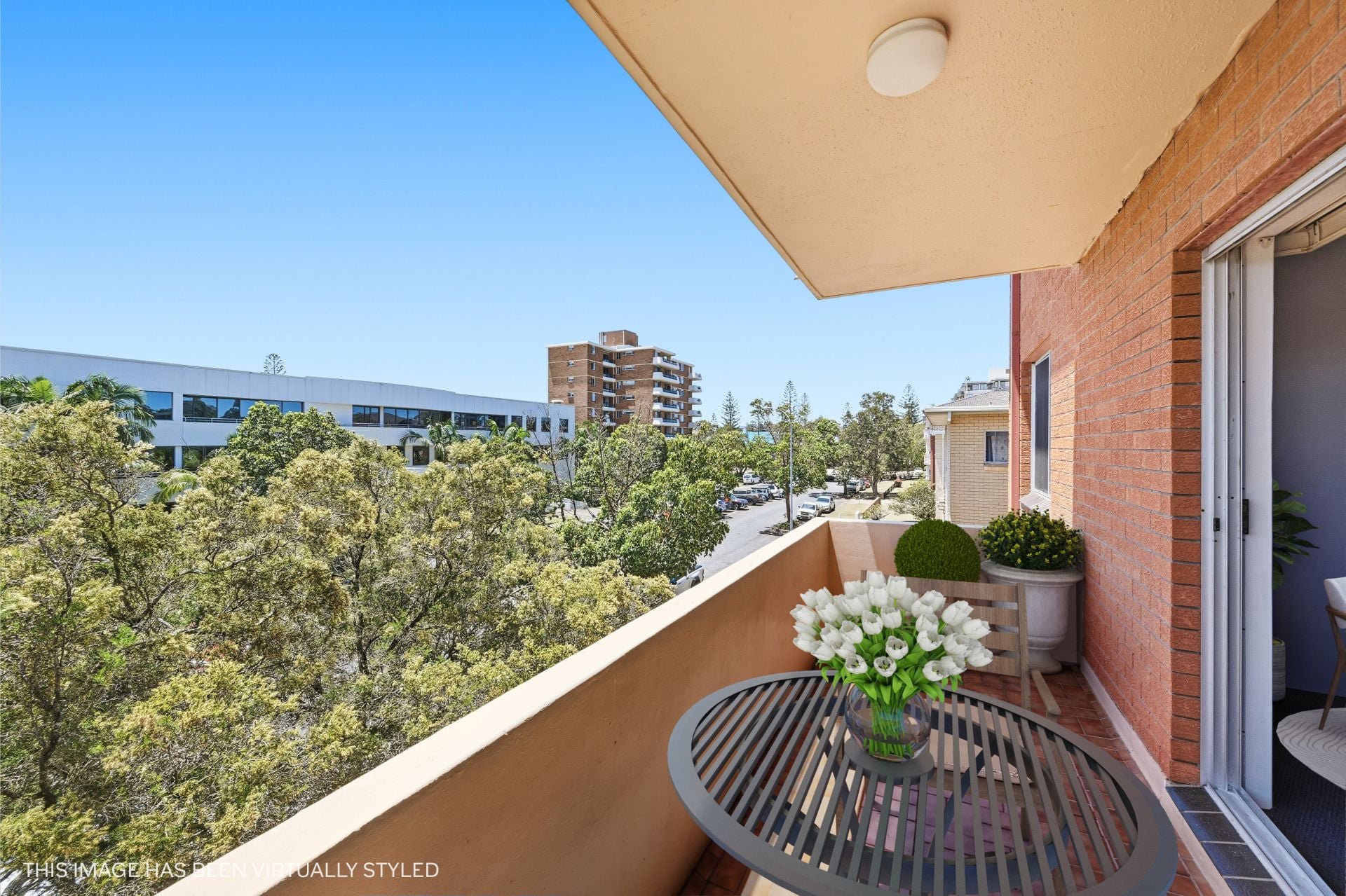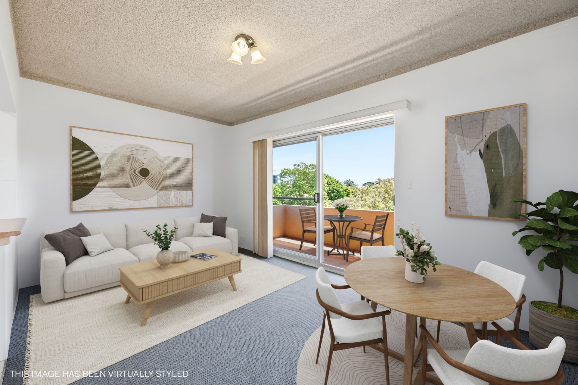 Inside, a light-filled open-plan living and dining zone connects through a wide glass slider to a generous north-facing balcony. With room for an outdoor setting and potted greenery, it takes in a leafy urban outlook and captures sunshine across the day - an easy spot for coffee, reading or unwinding as the afternoon settles.