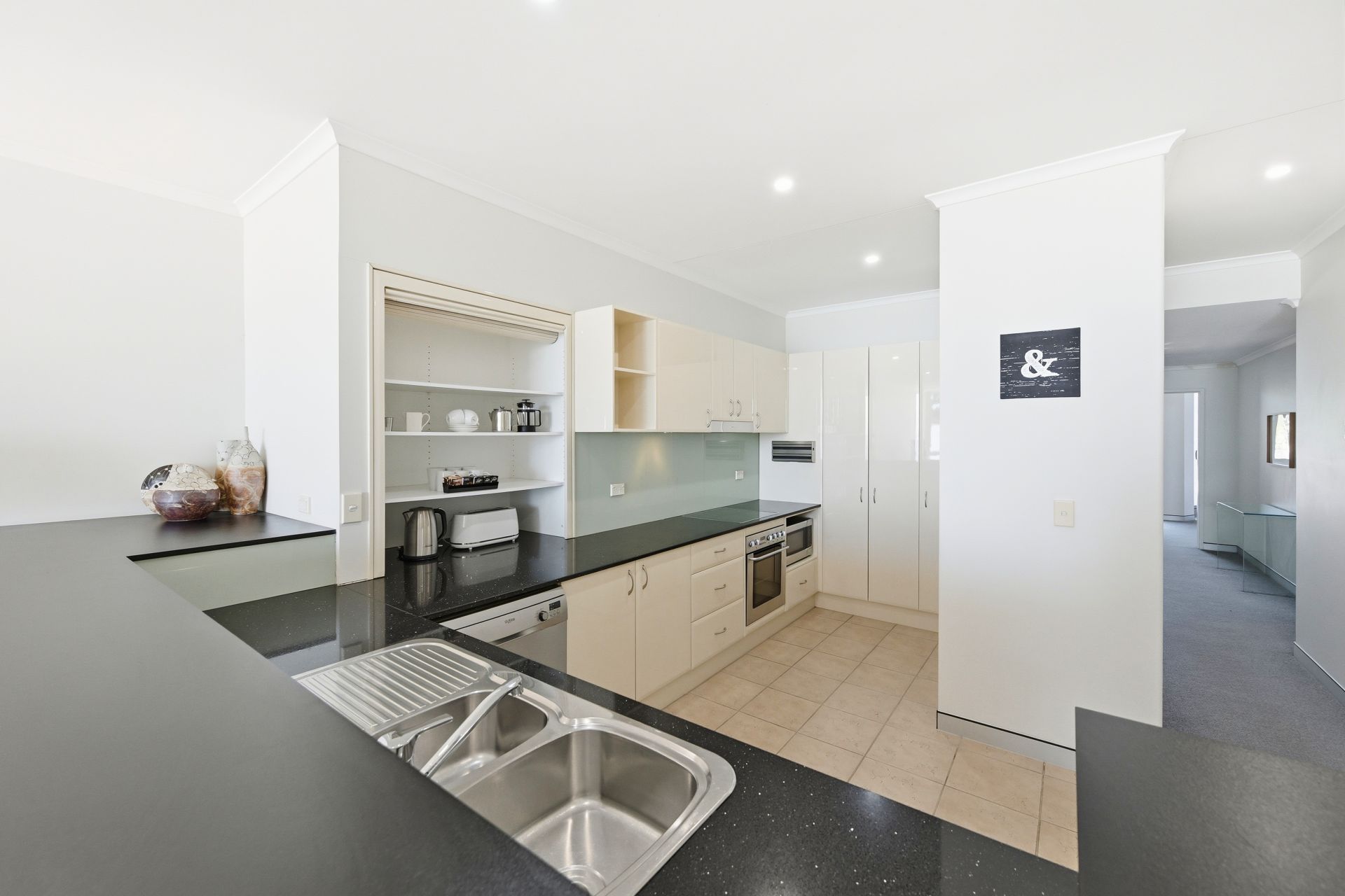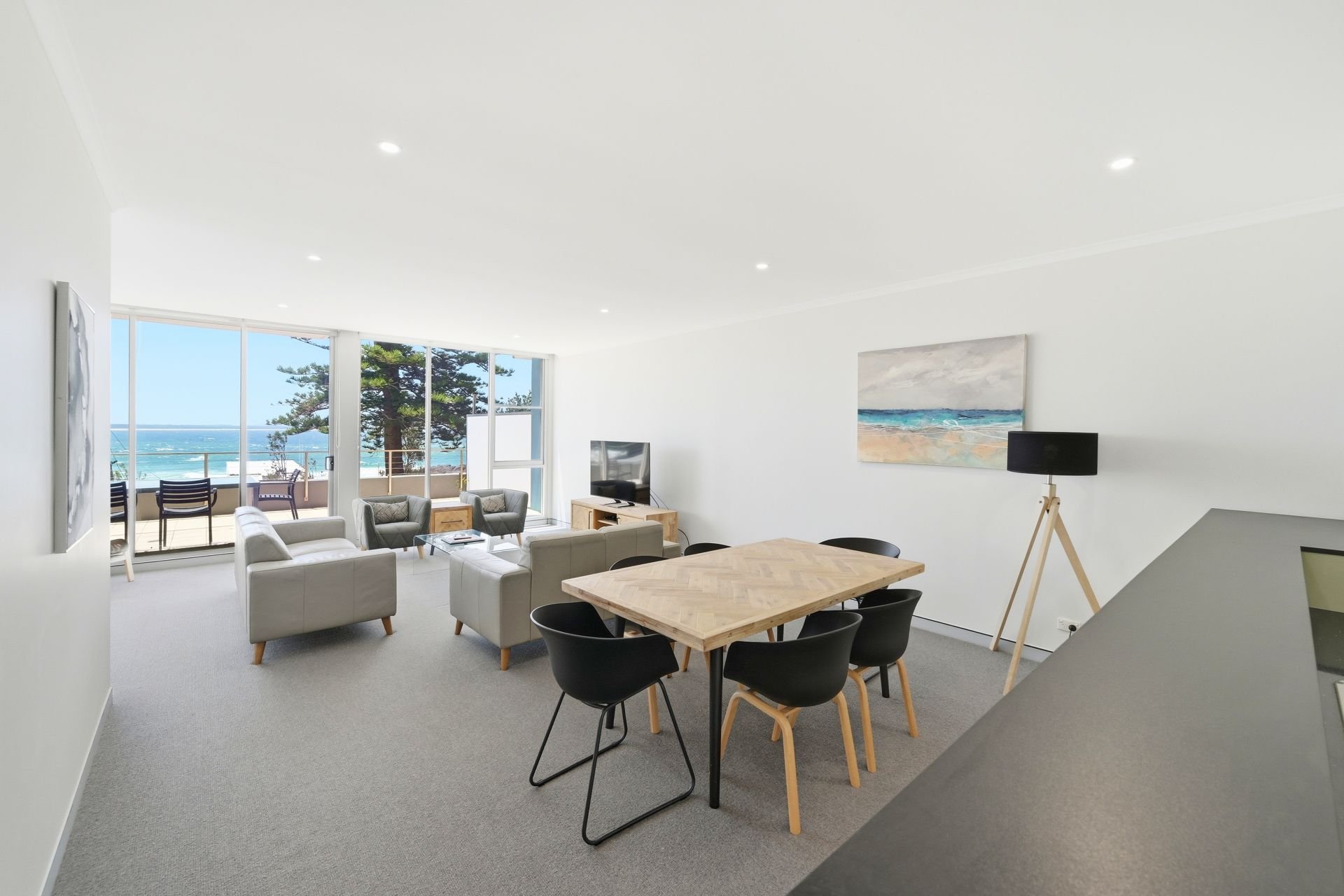 Generous glazing draws natural light through the open plan living and dining zone, framing the outlook to Town Beach and the ocean beyond. Wide sliding doors open to a broad, tiled front terrace - a wonderfully usable extension of the living space where there is ample room for outdoor dining, lounging and simply watching the beachside activity unfold.