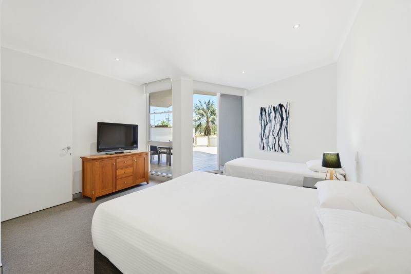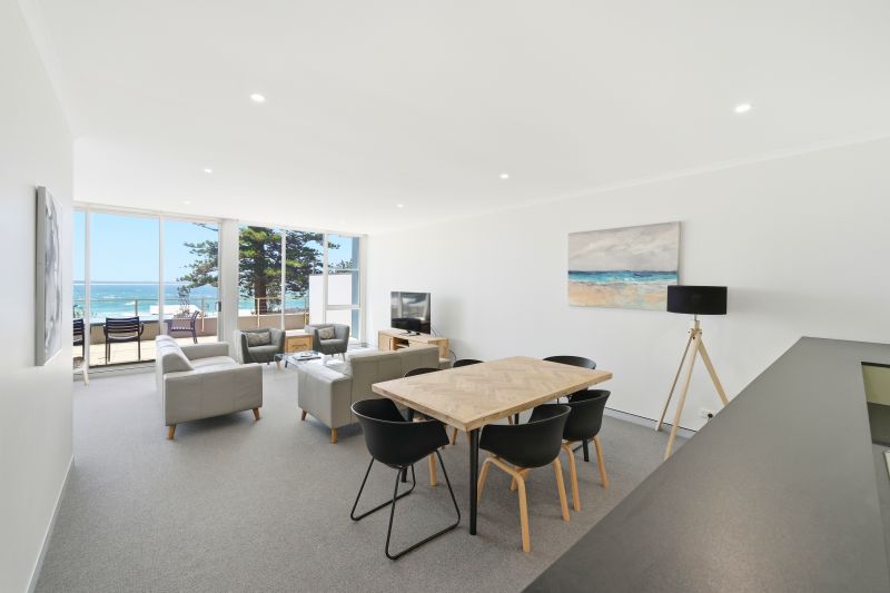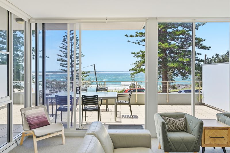 Positioned on an elevated terrace level in iconic 'Sandcastle' opposite Town Beach, this apartment blends easy indoor-outdoor living with a constantly shifting coastal scene across the sand, surf and Norfolk pines.