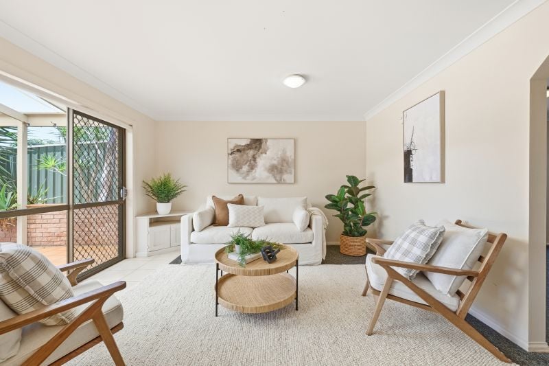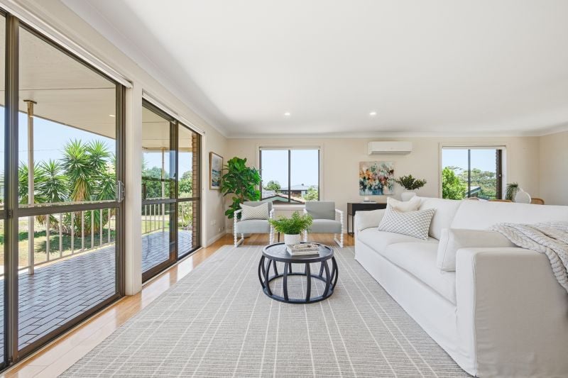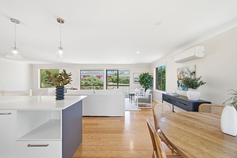 Across two levels, the layout balances connection and flexibility. On the upper floor, everyday living unfolds across two distinct zones. At the front, the lounge opens to a sheltered south-east facing patio that catches the morning sun and coastal breeze - a relaxed spot for coffee or an easy mid-week unwind.