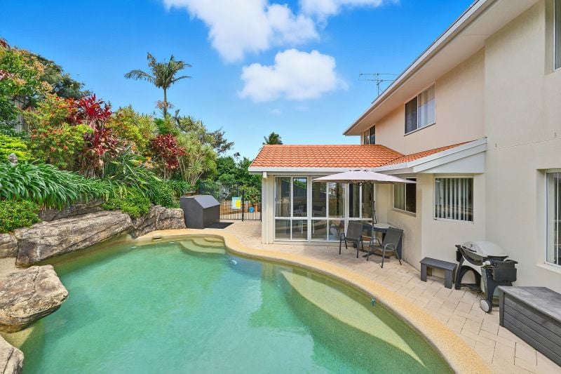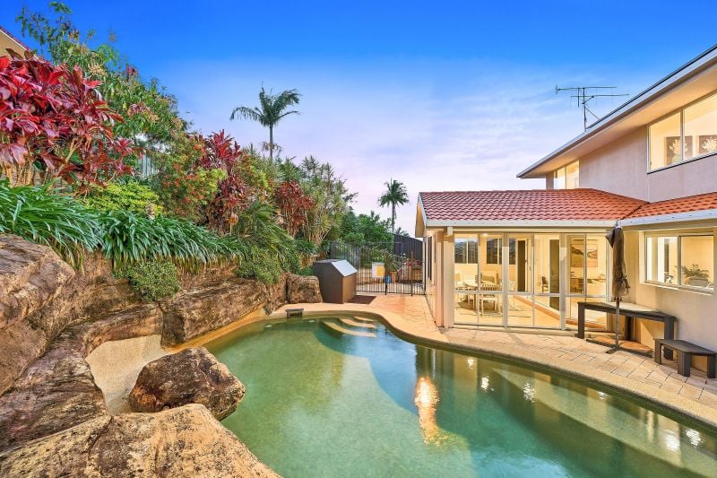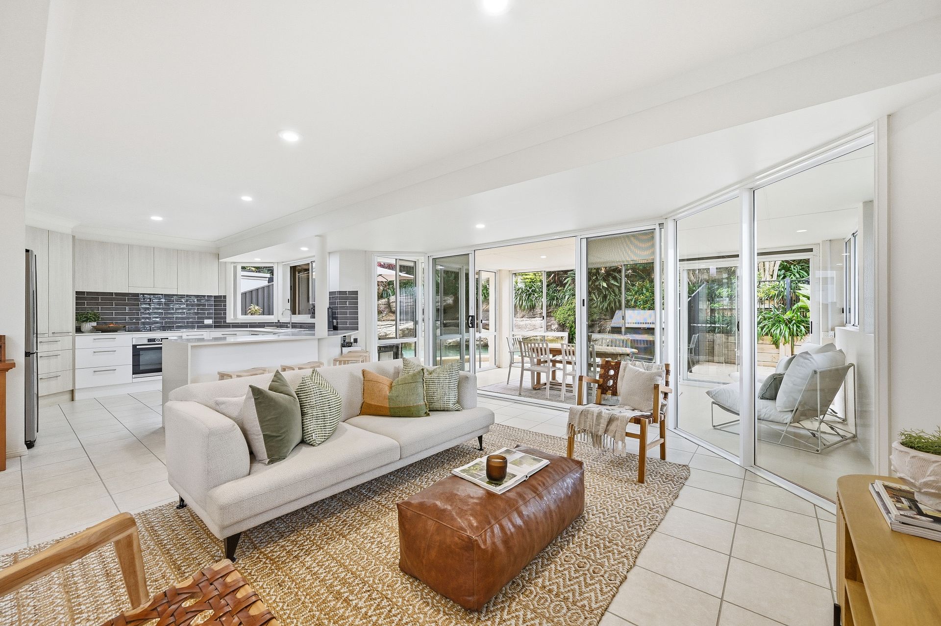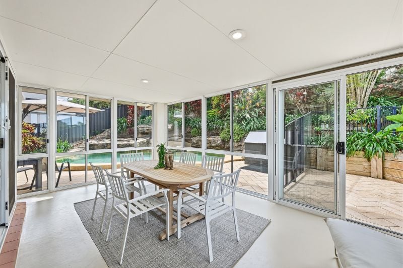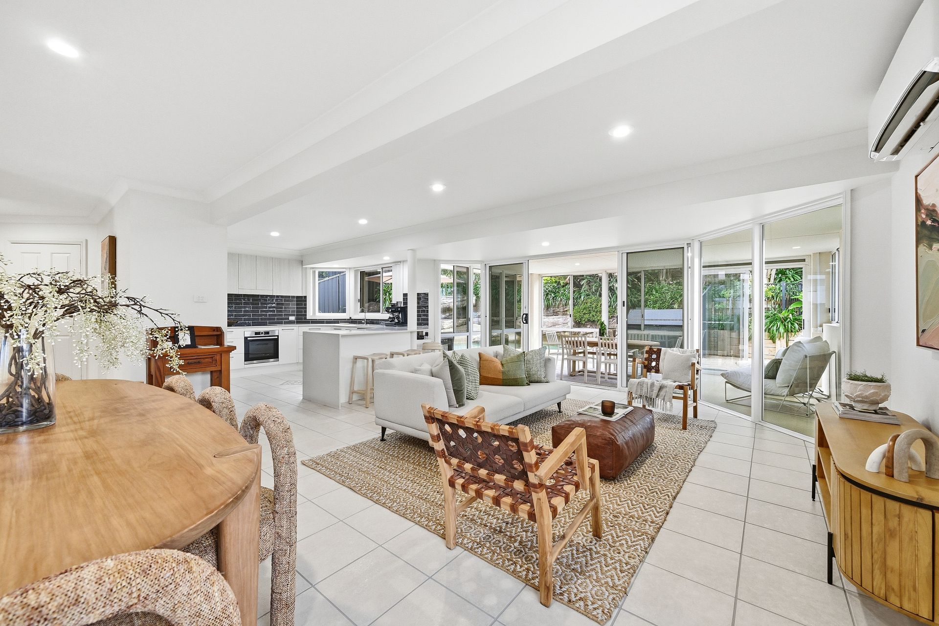Adjoining open-plan living and dining areas flow effortlessly to a glass-enclosed Queensland room overlooking tropical gardens and a tranquil pool terrace, perfect for year-round entertaining.
