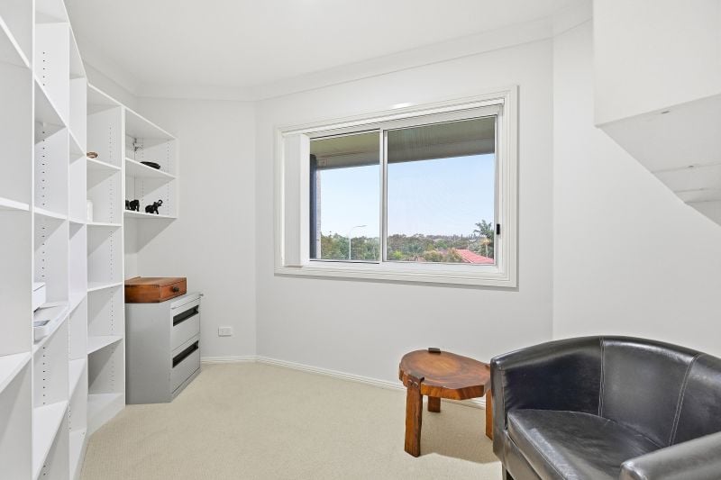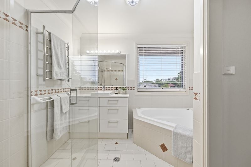 Accommodation comprises five bedrooms and a dedicated study, thoughtfully zoned across three levels. The master suite and one bedroom are located on the principal level, three further bedrooms occupy the upper floor, and a well-appointed study sits at entry level. The master enjoys private balcony access, a walk-in robe, and ensuite with corner spa, while all other bedrooms are spacious with built-ins and easy access to the three-way family bathroom.