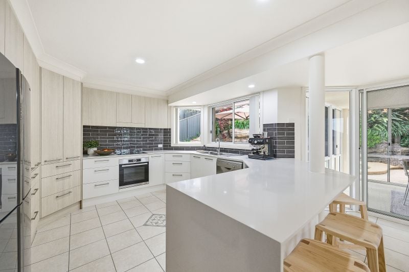 The heart of the home features a renovated kitchen showcasing stone benchtops, sleek cabinetry, stainless-steel appliances, and ample storage.