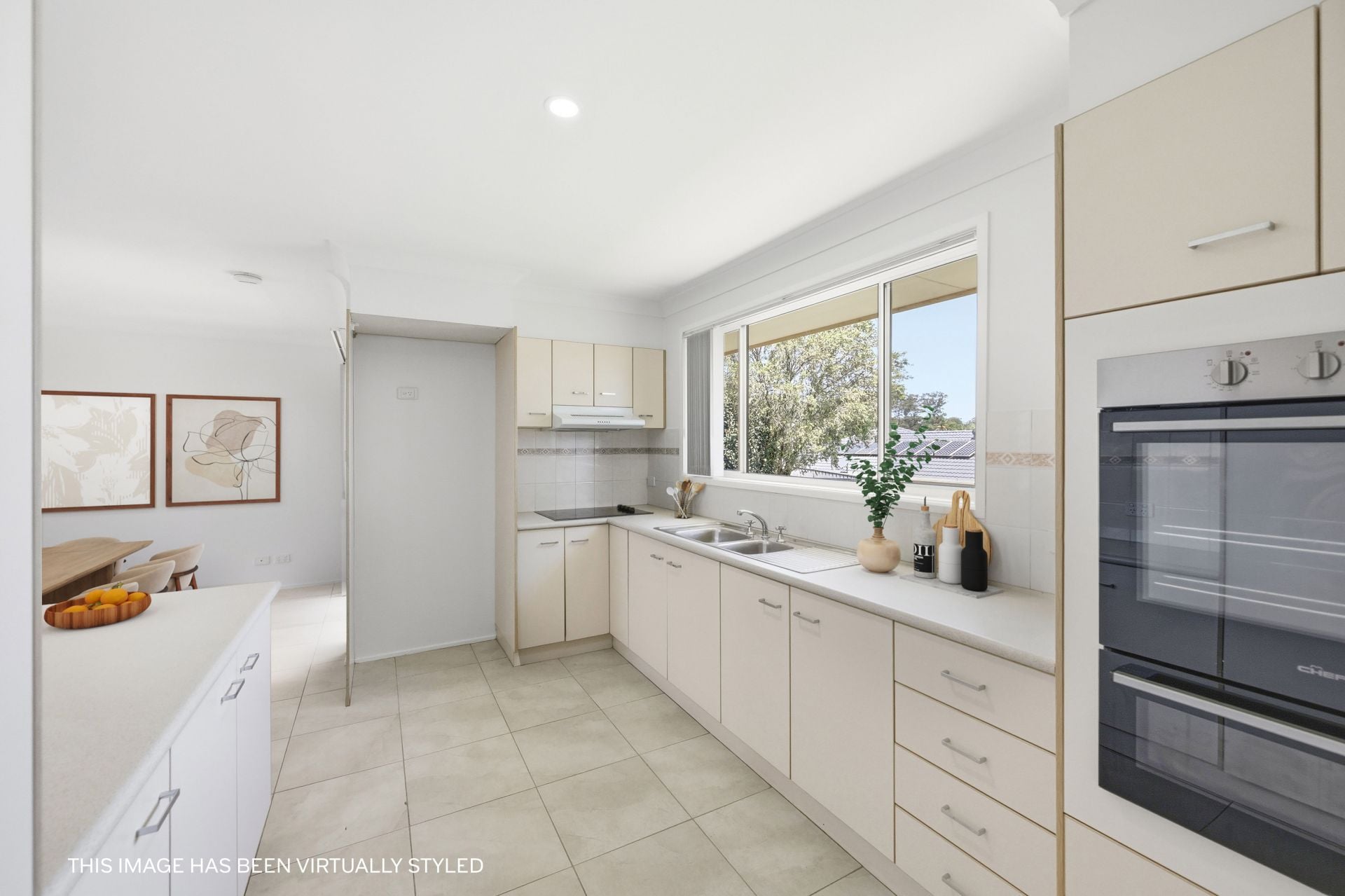 The adjoining kitchen keeps everything within reach, offering excellent storage, long benchtops, electric cooking and a wide window overlooking the backyard. Its central position ensures simple service to both the dining area and outdoor entertaining.