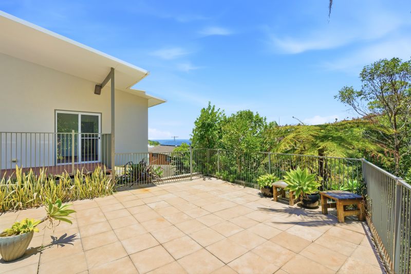 Sliding doors extend the living zone to a covered entertaining deck - a breezy, elevated platform for capturing sunrise, weekend gatherings or simply watching the horizon shift throughout the day. A second alfresco terrace enhances the home's connection to the outdoors, offering another restful space framed by lush treetops and coastal light.