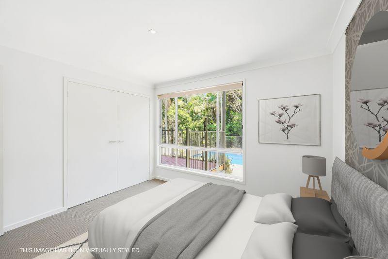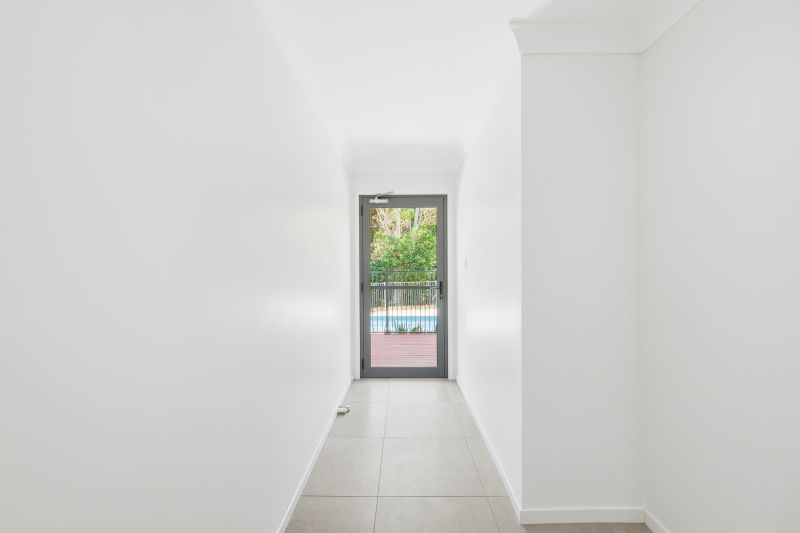 To the rear, the experience shifts into a private resort-like setting. The inground pool is bordered by a wide expanse of paved terrace and a backdrop of natural rainforest reserve, creating a secluded oasis for summer afternoons, relaxed entertaining or quiet hours beside the water. The feeling is one of complete privacy, wrapped in greenery.