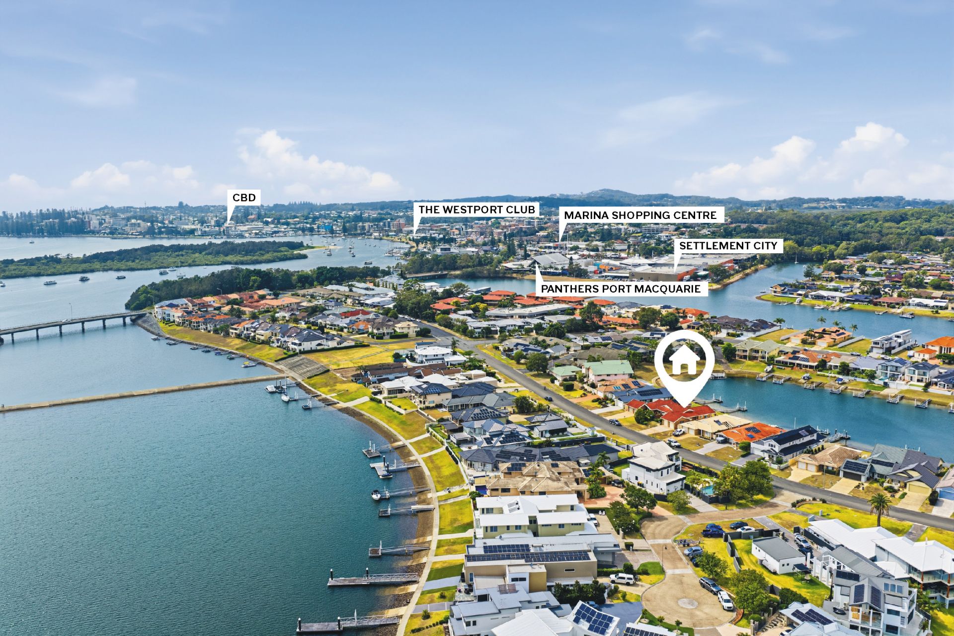 Despite the peaceful canal-side setting, daily convenience remains remarkably close. Settlement City, Panthers Port Macquarie, the marina and Marina Shopping Centre are all within approximately two minutes' drive, placing shopping, dining, entertainment and boating access effortlessly within reach while preserving the calm, waterside character of the address.