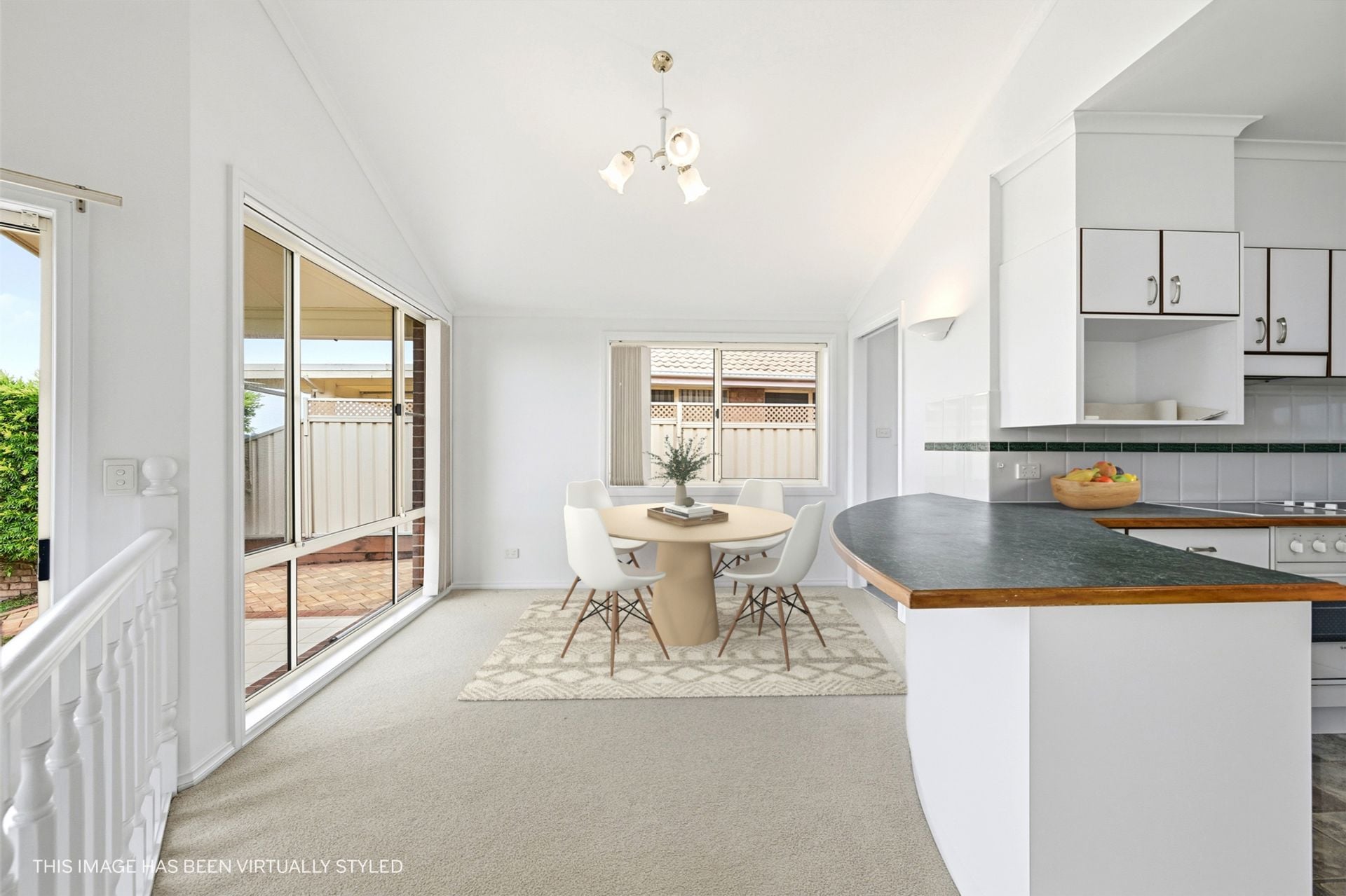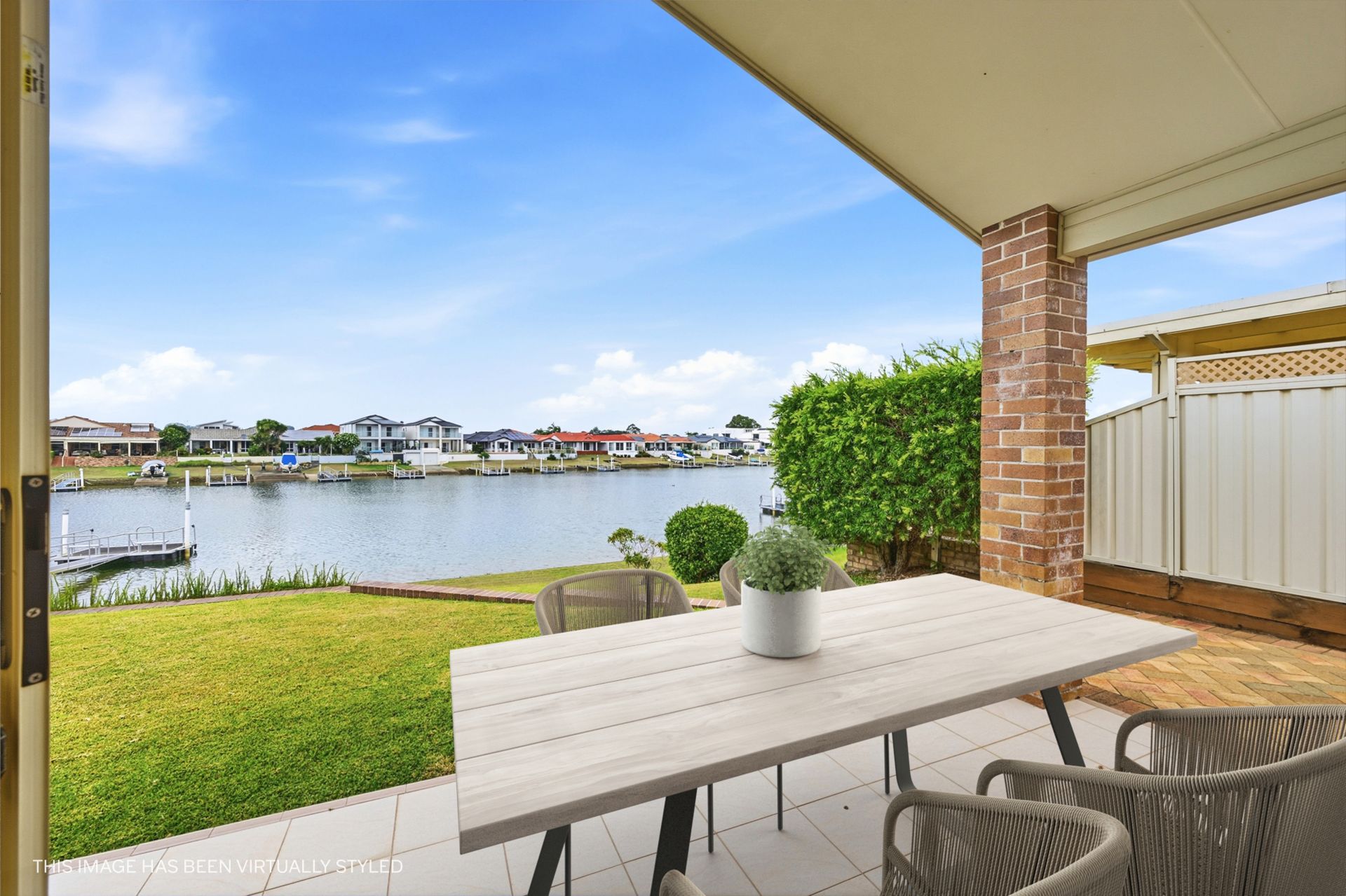 Sliding doors extend the meals area to a covered alfresco patio, creating an inviting outdoor setting for morning coffee, relaxed entertaining or simply enjoying the changing light across the canal. Beyond, gently sloping lawns lead directly to the water's edge, forming a peaceful backdrop that defines the home's lifestyle appeal.