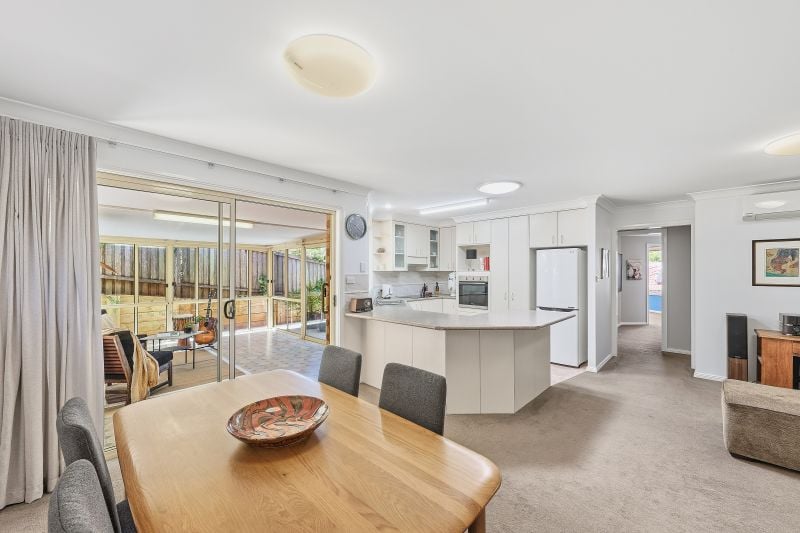 Completely level and beautifully presented, the home features two generous living zones offering flexibility for family living or quiet retreat. A welcoming lounge sits at the front, while the open-plan family and dining area provides an ideal setting for everyday enjoyment.
