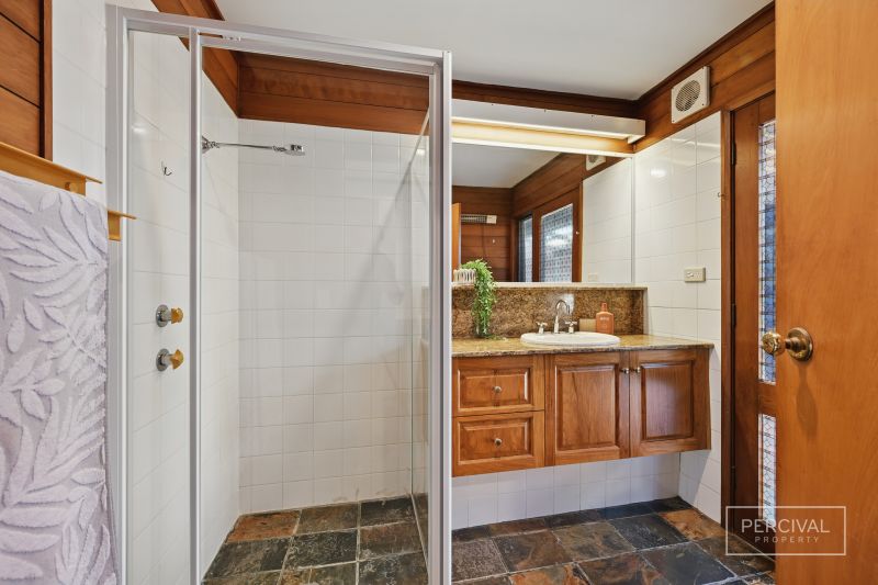 Level entry from the street welcomes you into a tropical oasis featuring a sunlit inground swimming pool and patio, all securely fenced. Step inside to a timber-panelled hallway, drawing you into a spacious living area that opens onto an enormous timber deck.