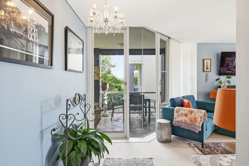 From its elevated position within the grounds, this apartment looks out across the pool and landscaped surrounds toward the water, capturing natural light, cooling breezes and the relaxed feel of this tightly held waterside setting.
