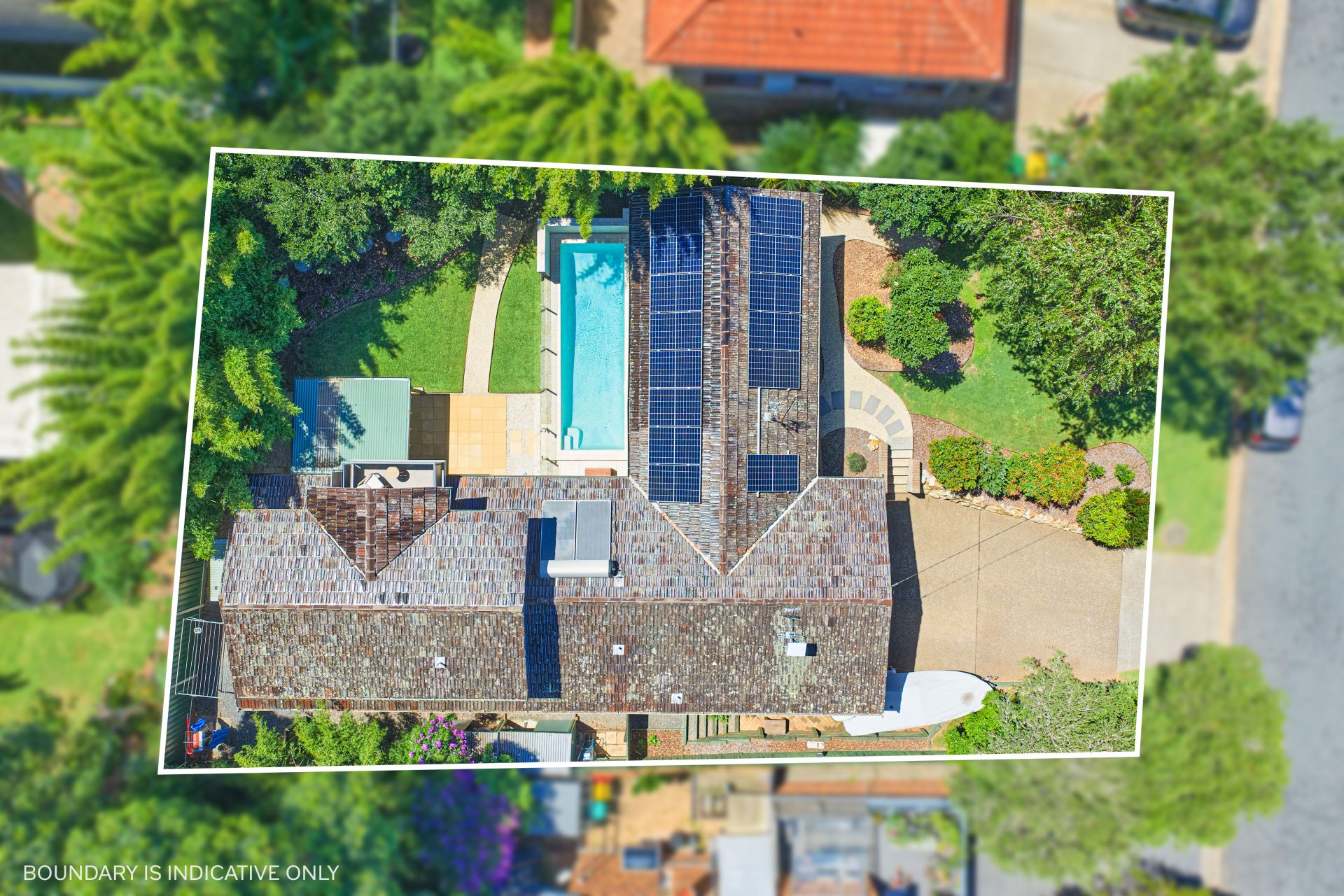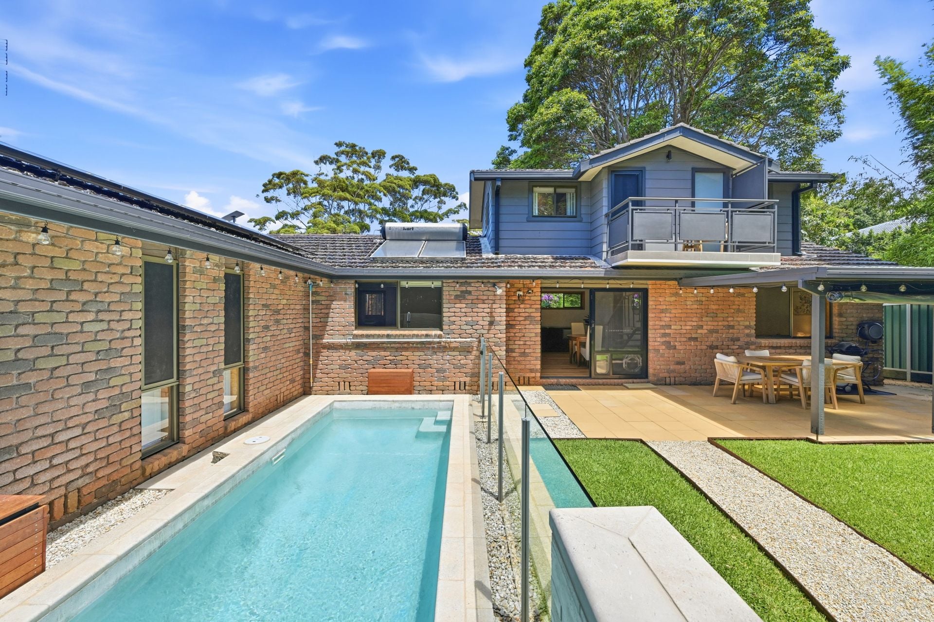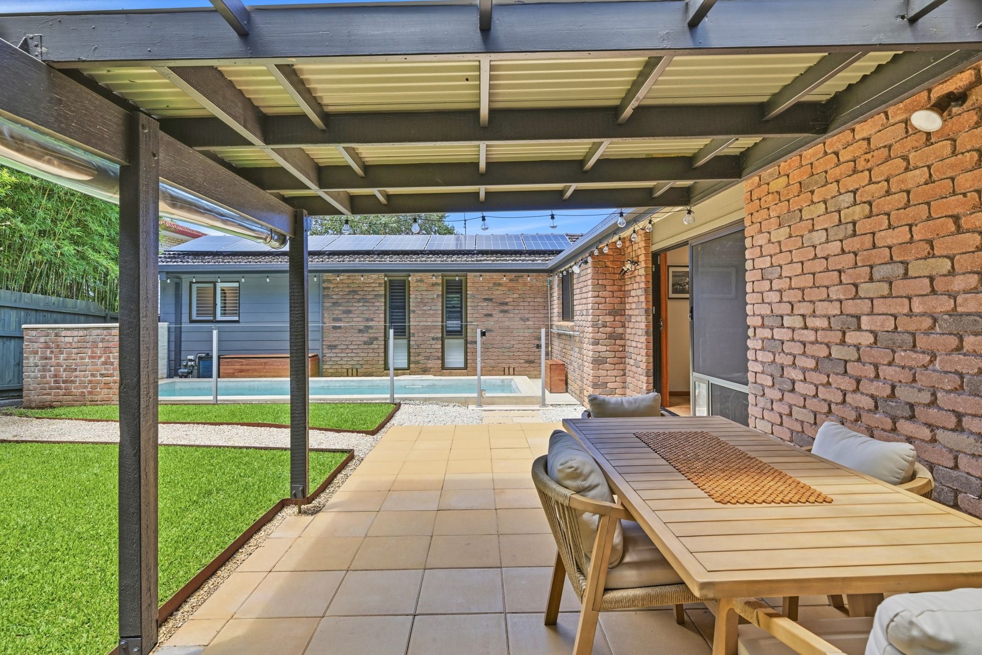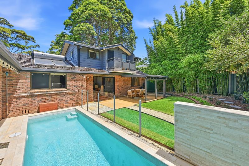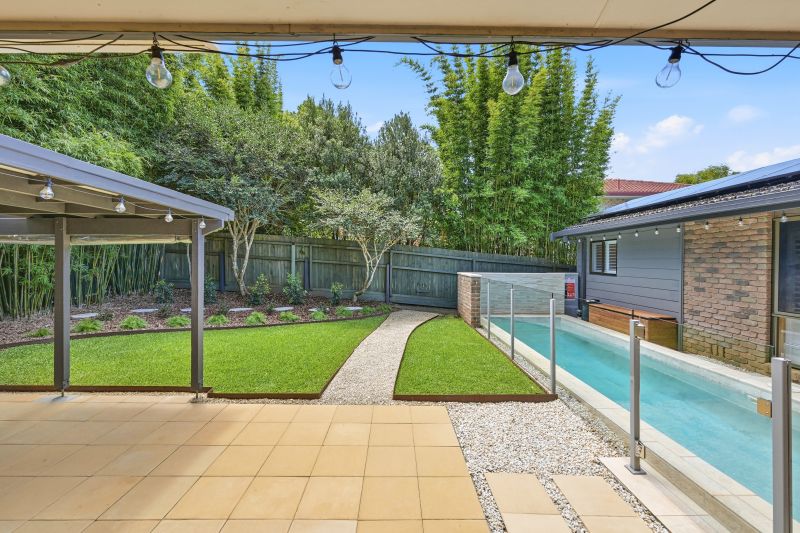 Sliding doors draw the indoors outward to a covered entertaining area, where paved surrounds and garden outlook create a natural extension of the living space. Beyond, the pool courtyard has been thoughtfully structured - a heated inground pool framed by glass fencing, a lawn terrace running alongside the water, and curved pathways weaving through established plantings and mature bamboo screening. The result is private, layered and highly usable outdoor space that feels settled and considered.