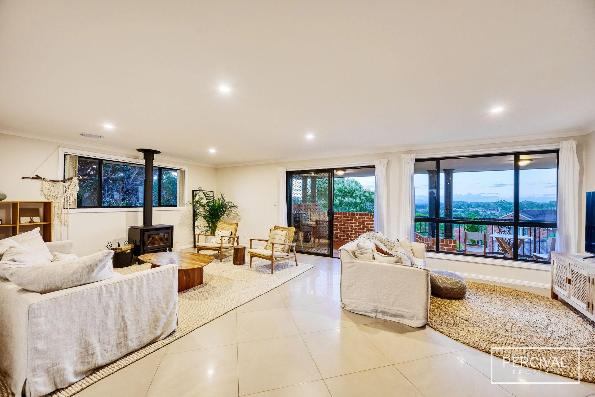 Upstairs, light-filled interiors showcase open-plan living and entertaining zones designed for effortless flow and separation. The living area features an ambient slow combustion fireplace and opens to an elevated, covered patio with a gorgeous district outlook and panoramic hinterland views. The dining area and a second meals or living zone create seamless transitions for everyday living or entertaining.