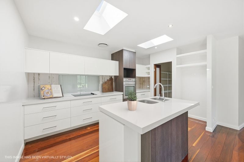 At the centre, the kitchen is designed for both presence and performance. Caesarstone surfaces, a walk-in pantry, island bench configuration and quality appliances deliver everyday efficiency, while remote-operated skylights with rain sensors introduce natural light and subtle innovation.