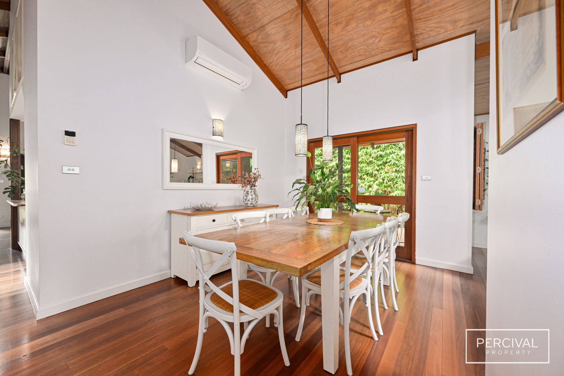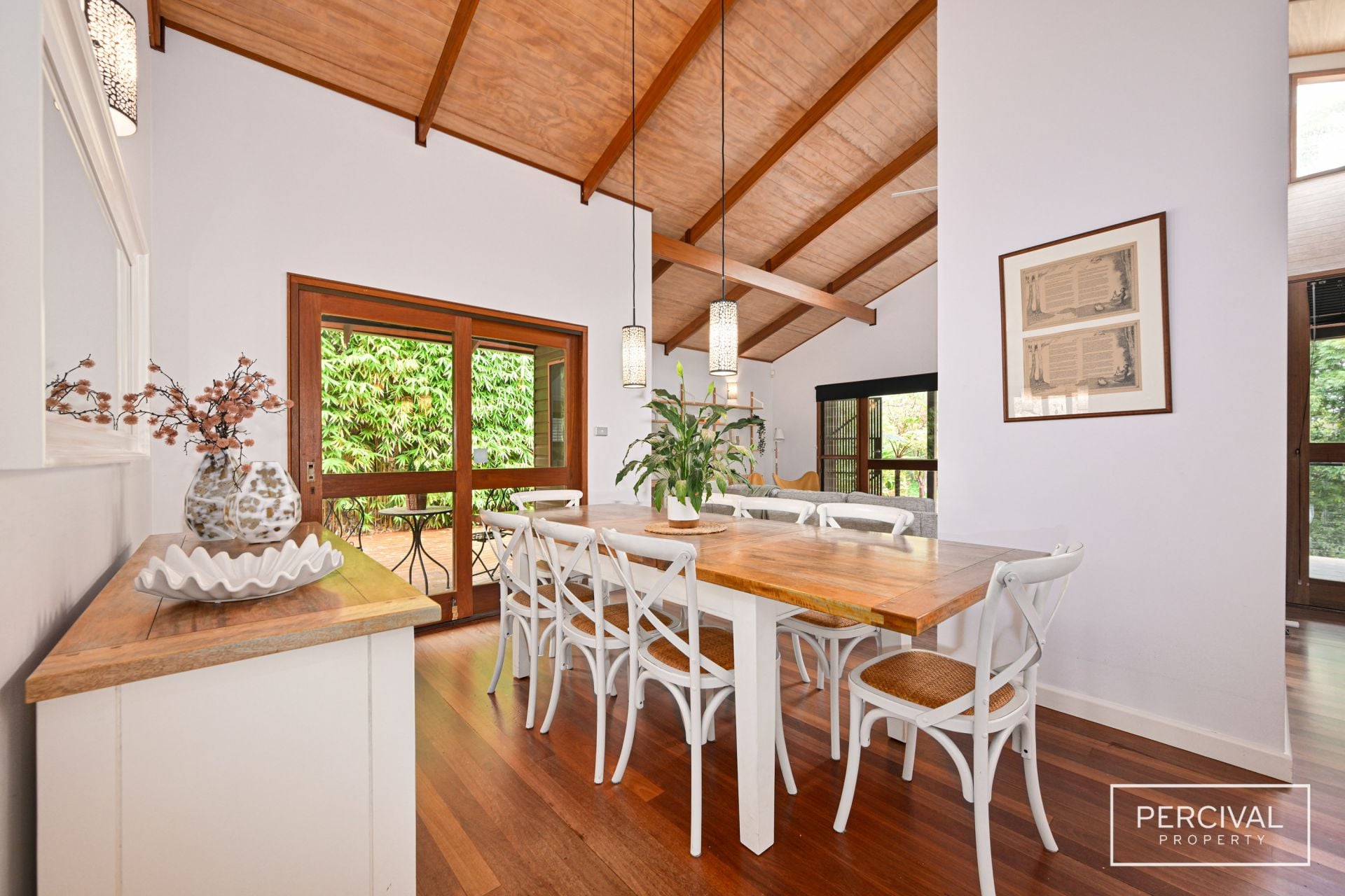 Nestled within lush tropical gardens and fronting a tranquil nature reserve, every element of the home enhances its sense of place, from the soaring raked ceilings and polished hardwood floors to the French glass doors and cedar shutters that filter dappled light through the interiors.