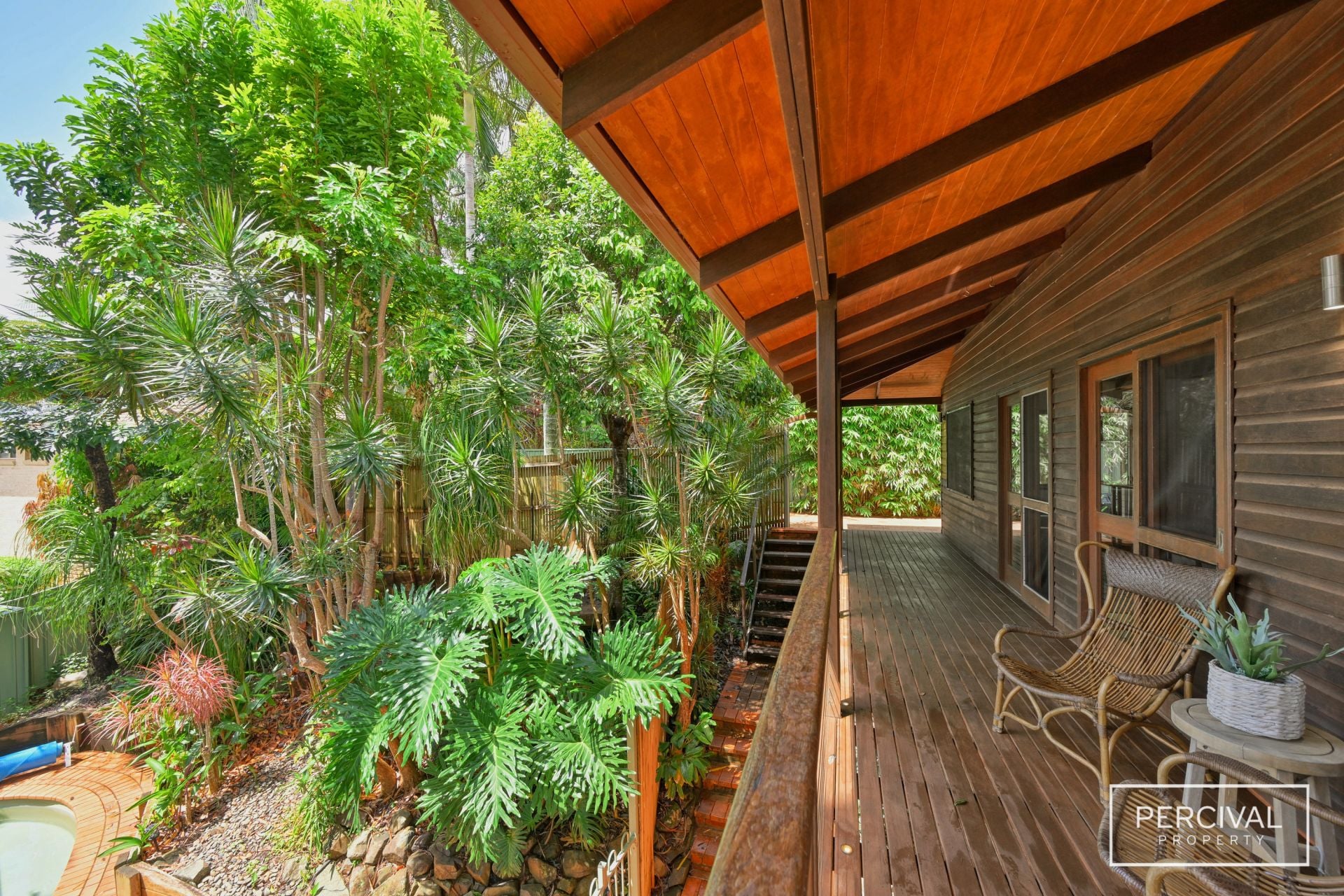Outside, curated tropical gardens enhance the home's sense of privacy, while the pool area promises endless summer enjoyment.