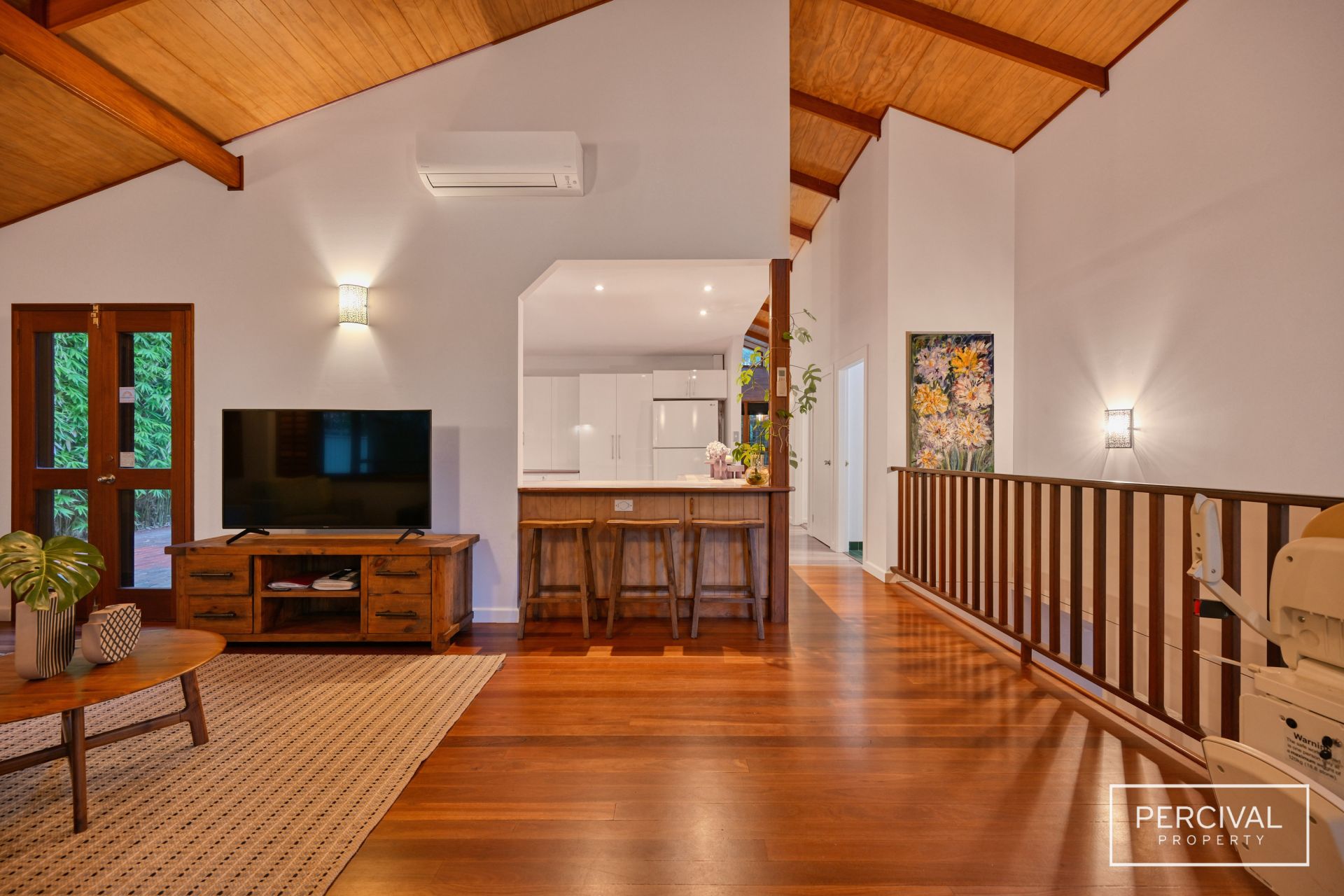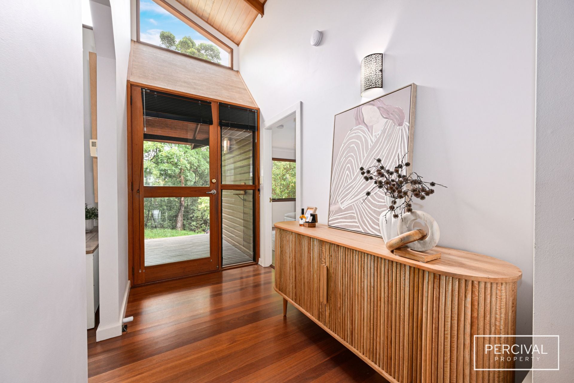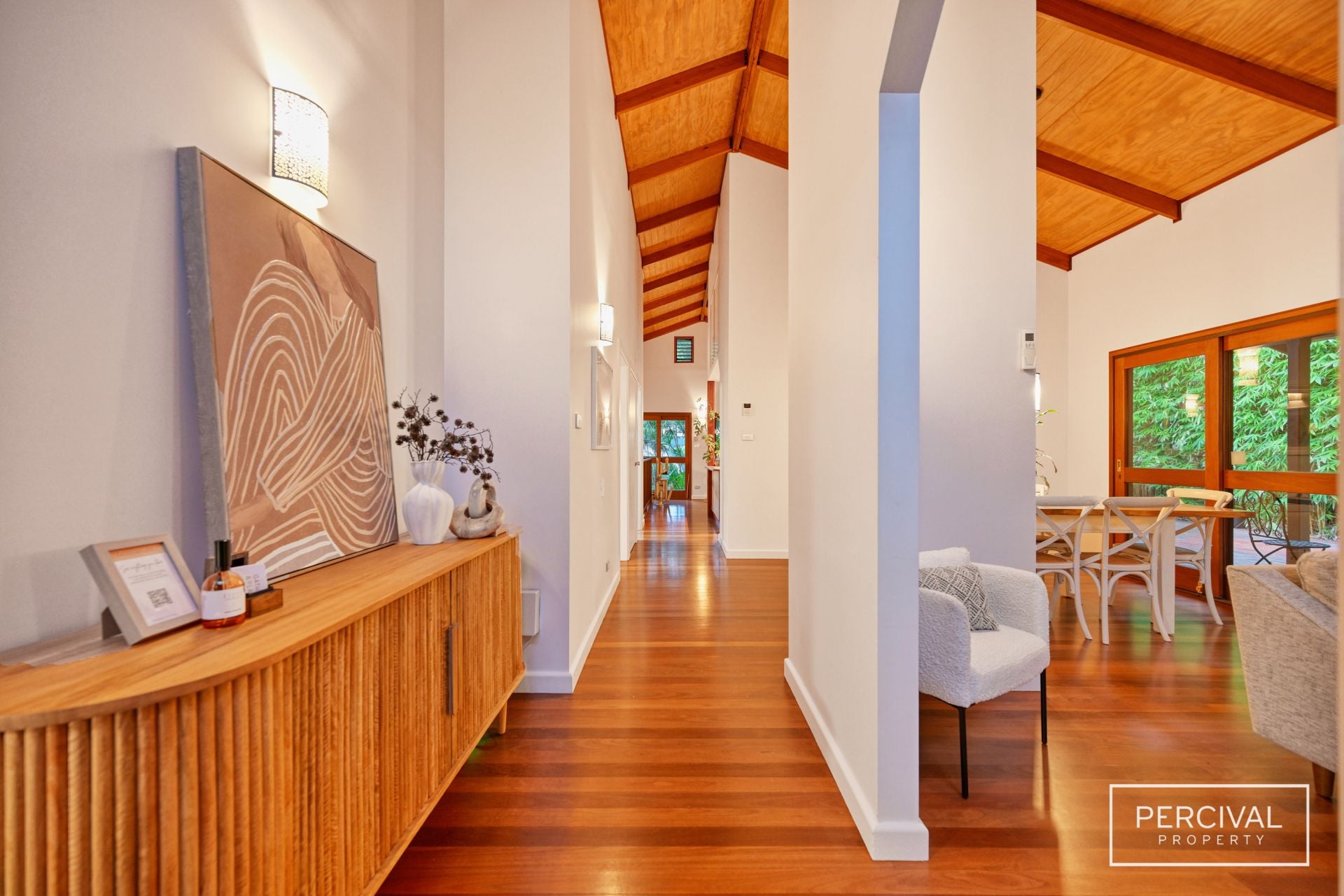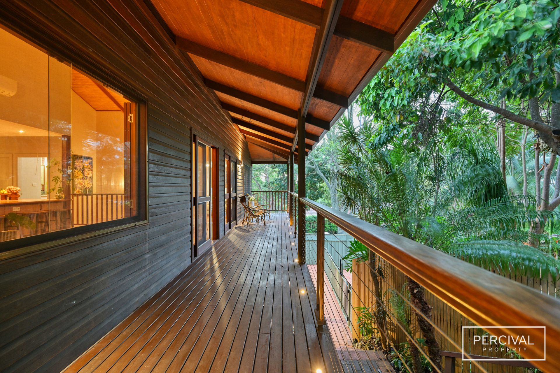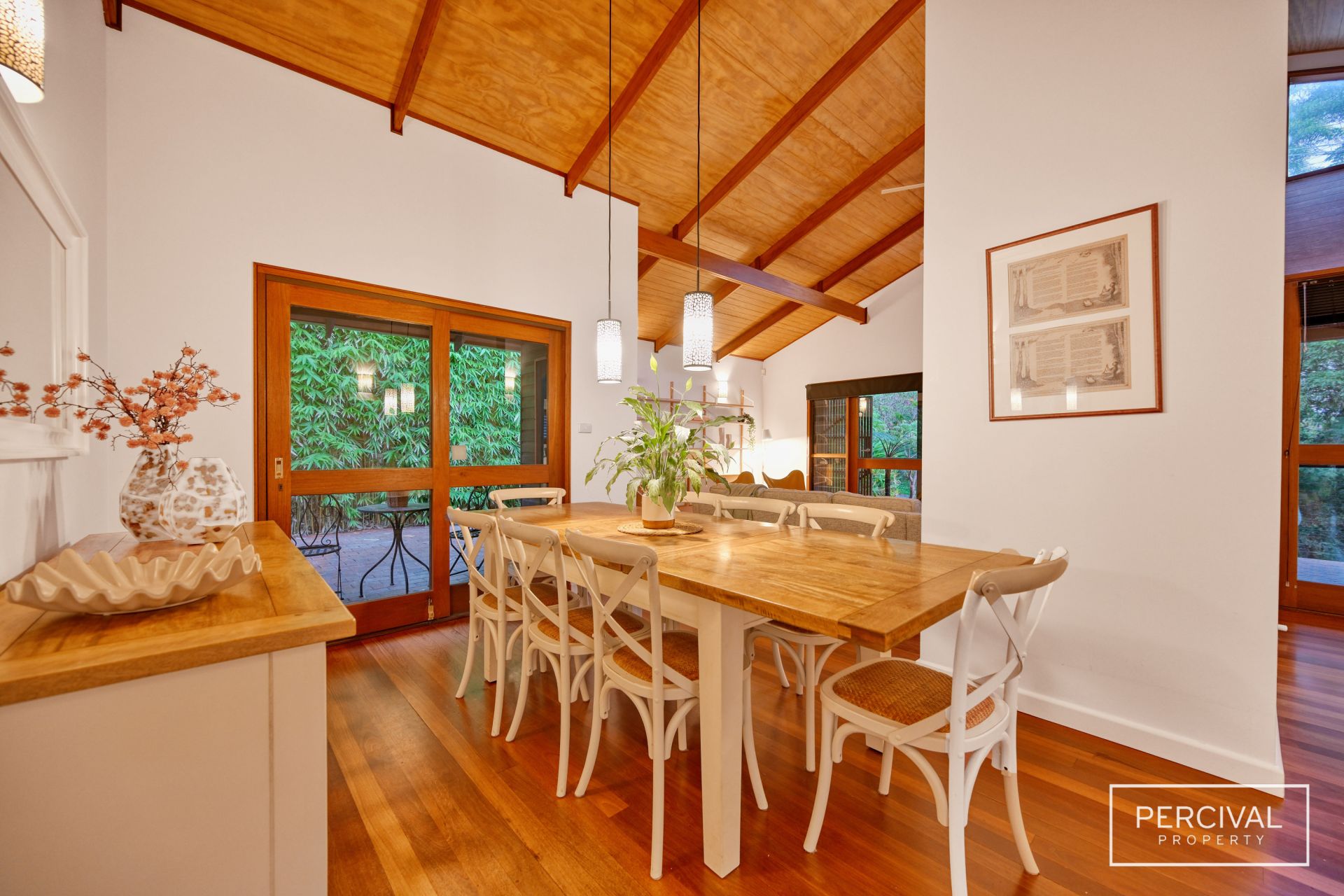 Polished Australian hardwood floors flow throughout the light-filled interiors, where expanses of glass frame the ever-changing beauty of the natural surroundings. The upper level is the heart of the home, featuring a contemporary kitchen with timber bench tops, two generous living zones and a dining space that opens onto a private paved entertaining terrace. At the rear, a covered timber deck overlooks the sparkling pool, while the front verandah takes in the tranquil outlook across the reserve.