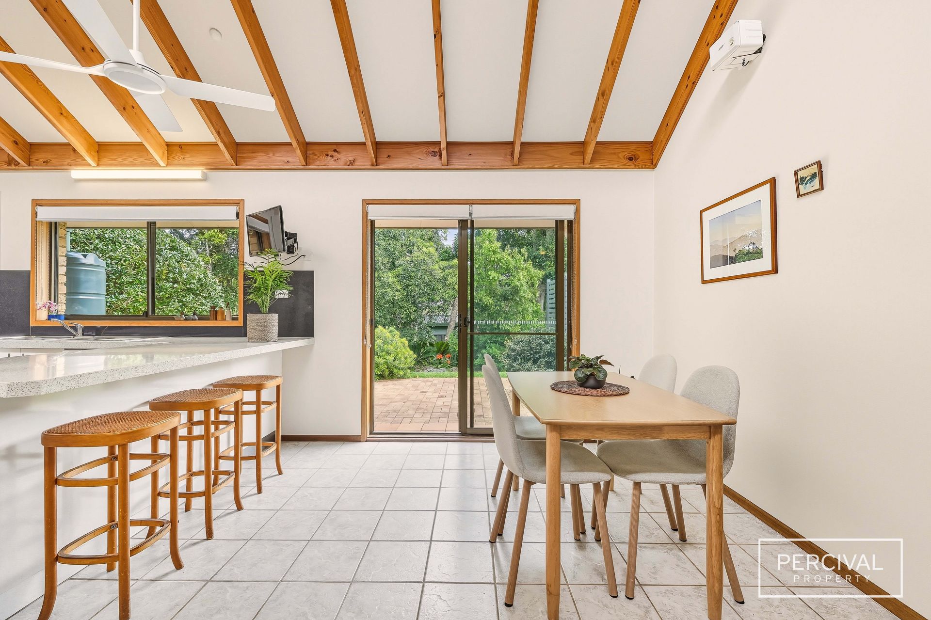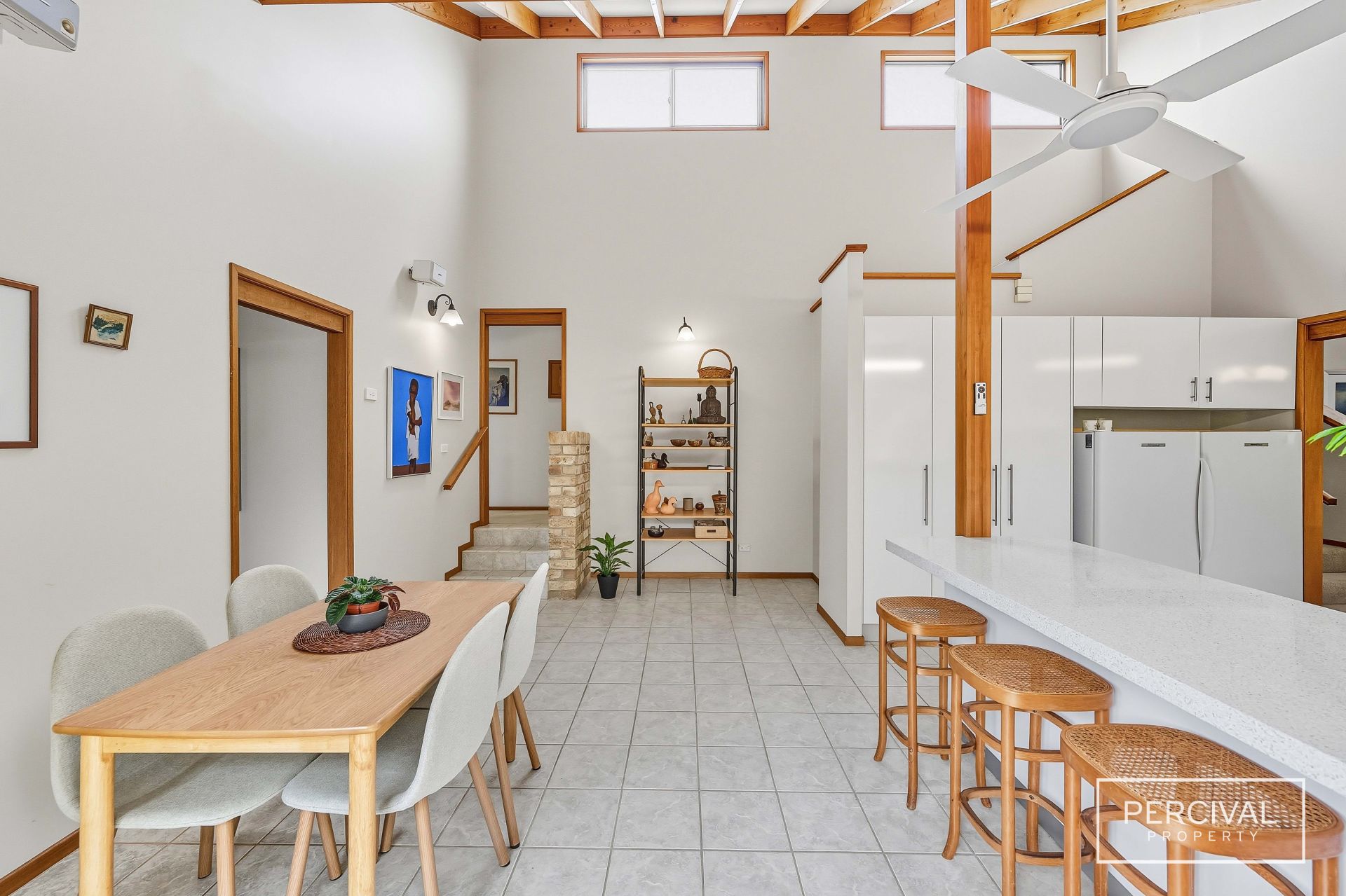 The open-plan living and dining zone unfolds beneath soaring ceilings, framed by leafy garden outlooks that reinforce the home's sense of privacy.