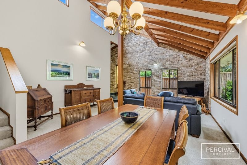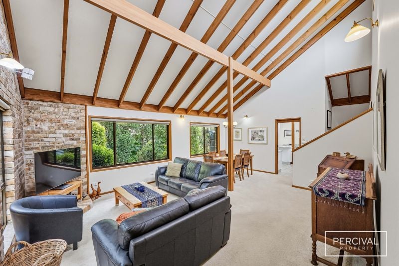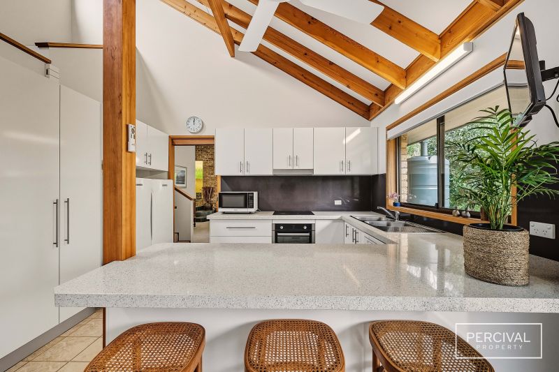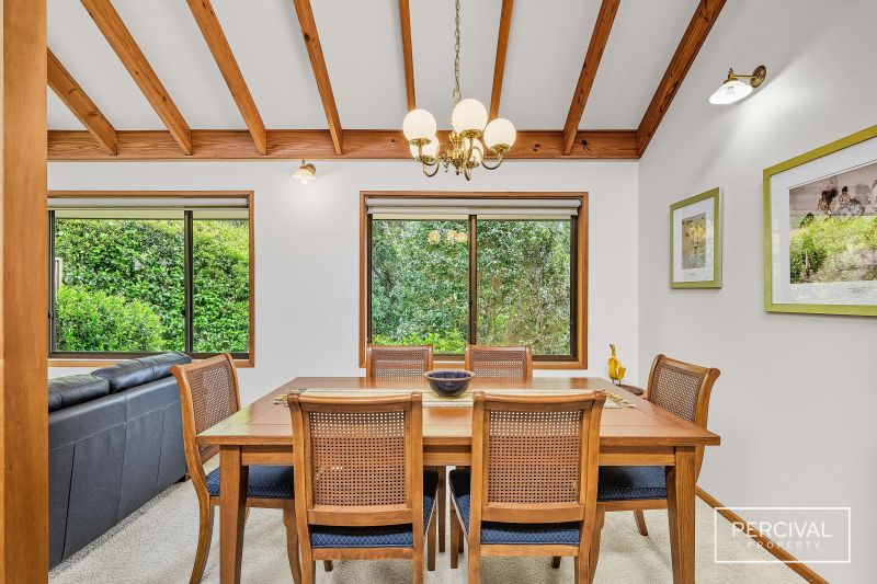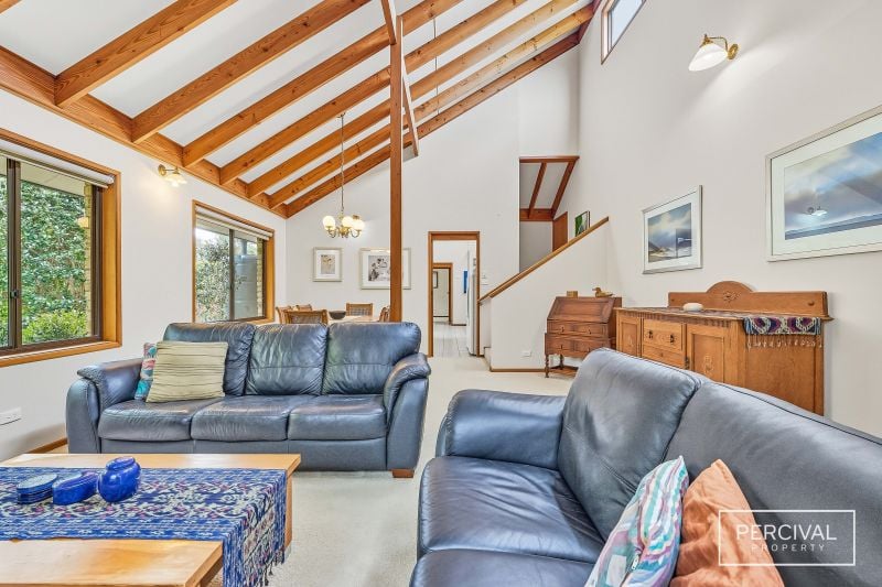 Set within established gardens, the home includes a double garage with internal access and thoughtful details that support comfort. Its split-level design and natural material palette remain true to a timeless style that continues to sit beautifully within its coastal environment.
