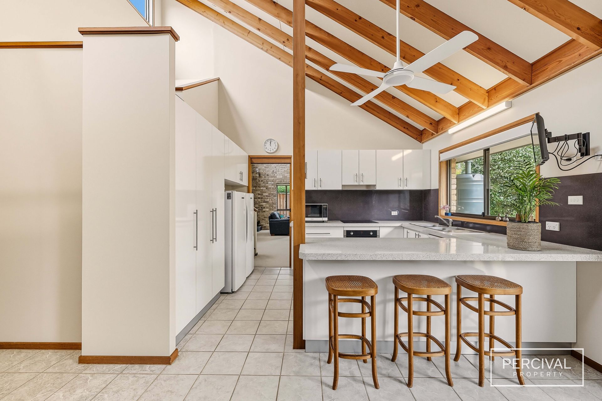 Adjoining, the kitchen and meals area continue the seamless flow between indoors and out, with Caesarstone benchtops, a glass splashback and generous cabinetry pairing practicality with understated style. Sliding doors open to a rear garden surrounded by established greenery - a tranquil space for quiet mornings or relaxed entertaining with family and friends.