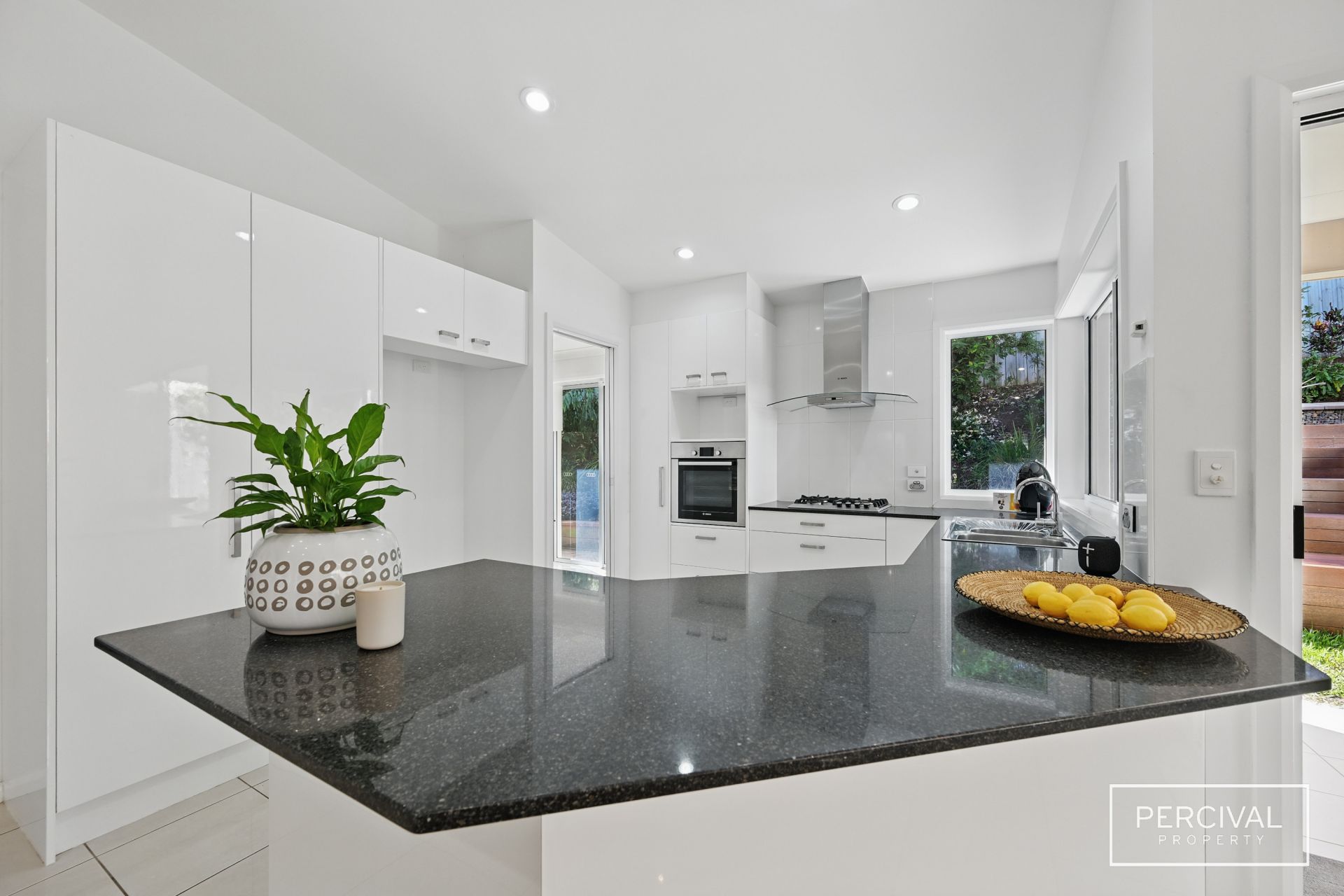 The open-plan living area is designed for relaxation, featuring tiled flooring for a sleek, low-maintenance finish and reverse-cycle air conditioning for year-round comfort. The kitchen is a statement in both form and function, offering abundant storage - including a double door pantry - gas cooktop, wall oven, and dishwasher, making everyday living and entertaining effortless.
