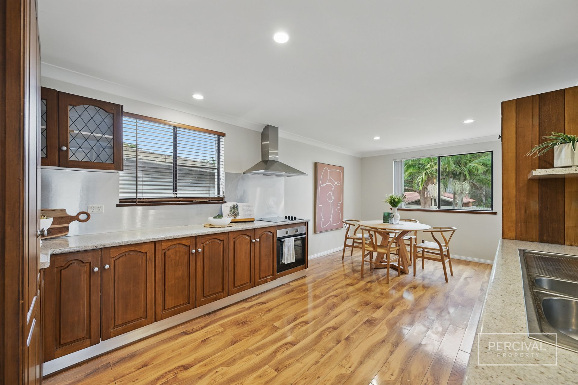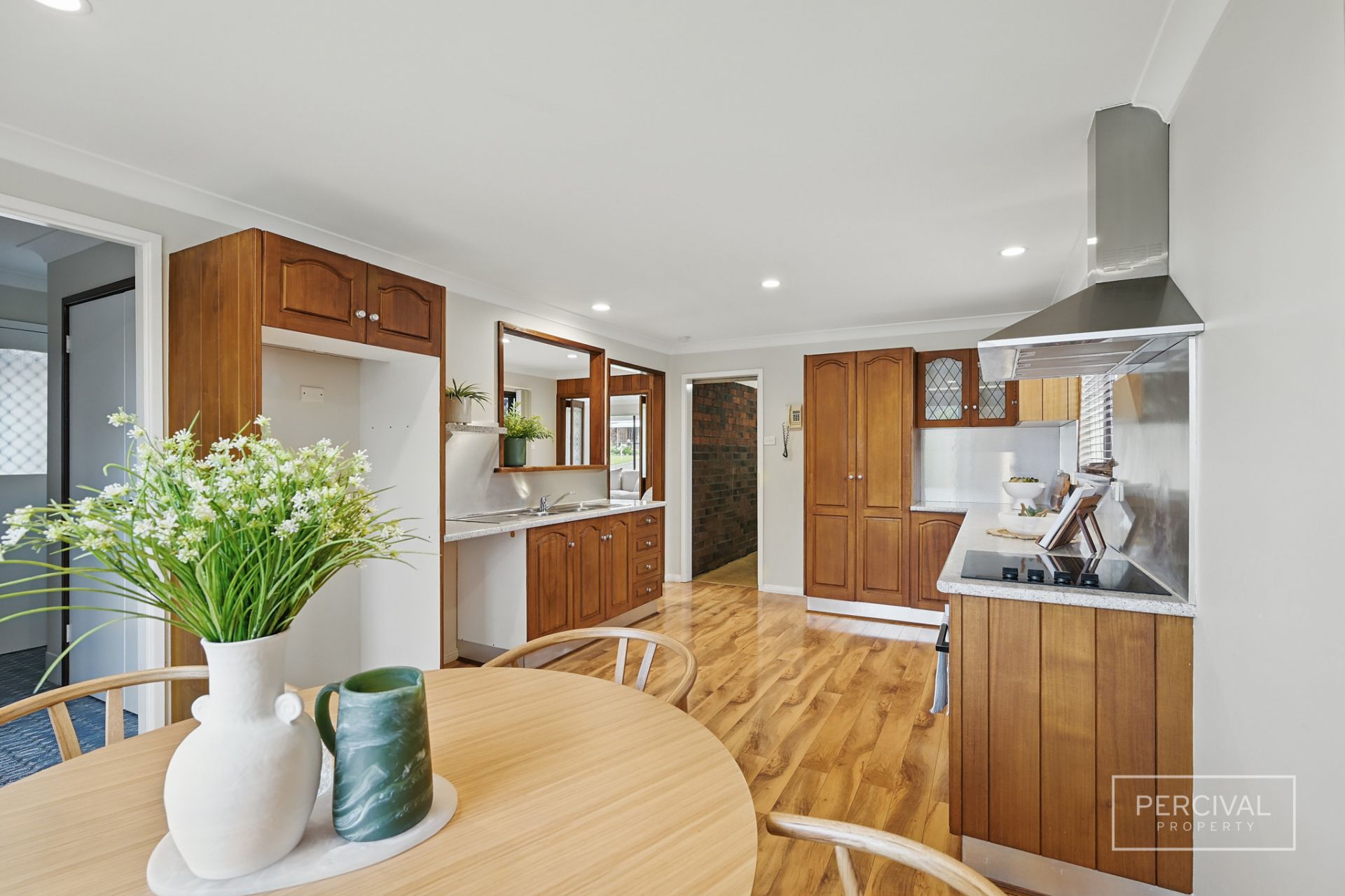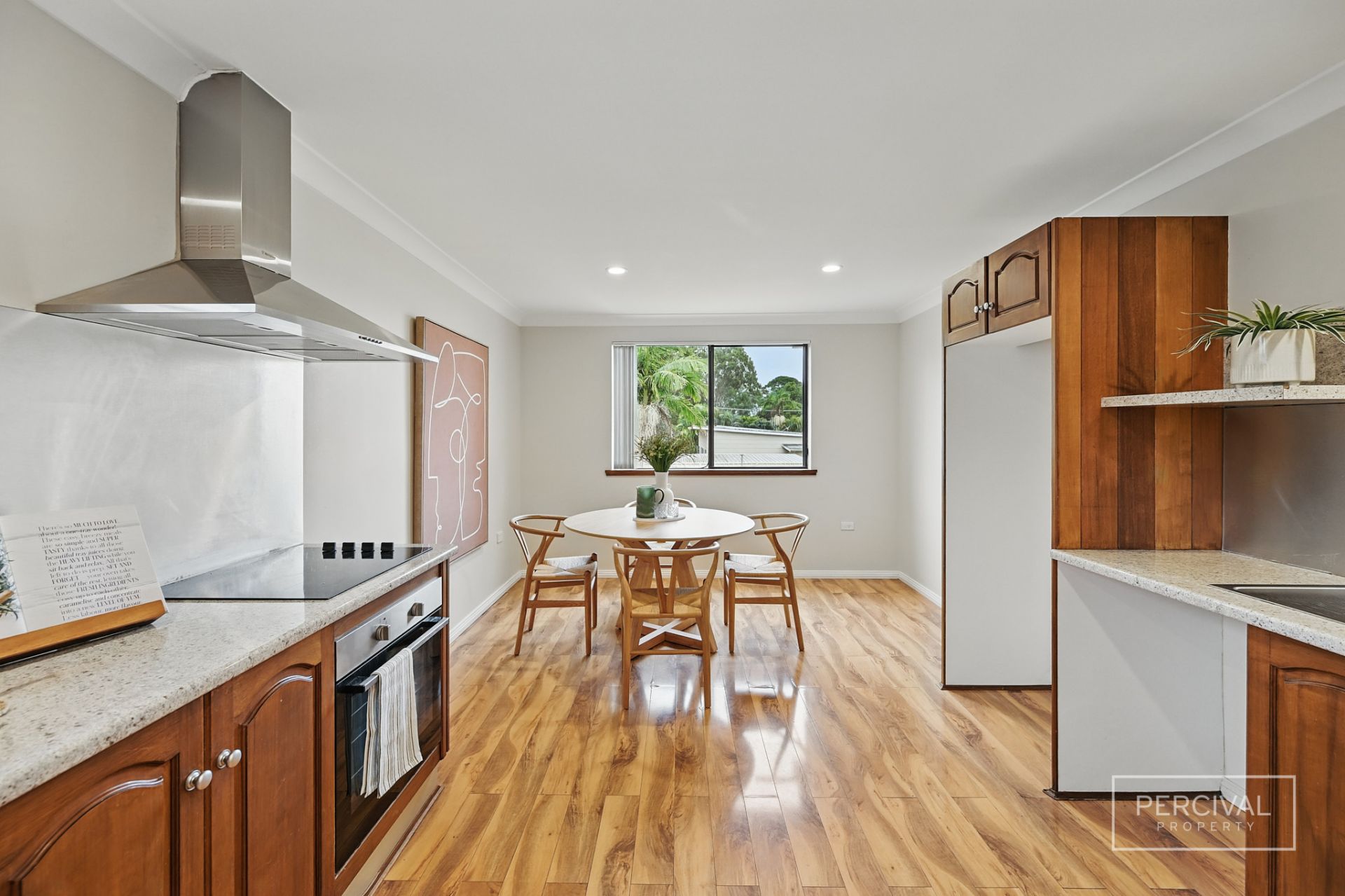 The living zones, finished with timber-look flooring, include a lounge room with reverse cycle air conditioning, a kitchen with timber cabinetry and electric cooking, and an adjoining meals area. A separate formal dining room opens to the covered alfresco space-creating a flexible second living area or a relaxed entertaining zone with excellent indoor-outdoor connection.