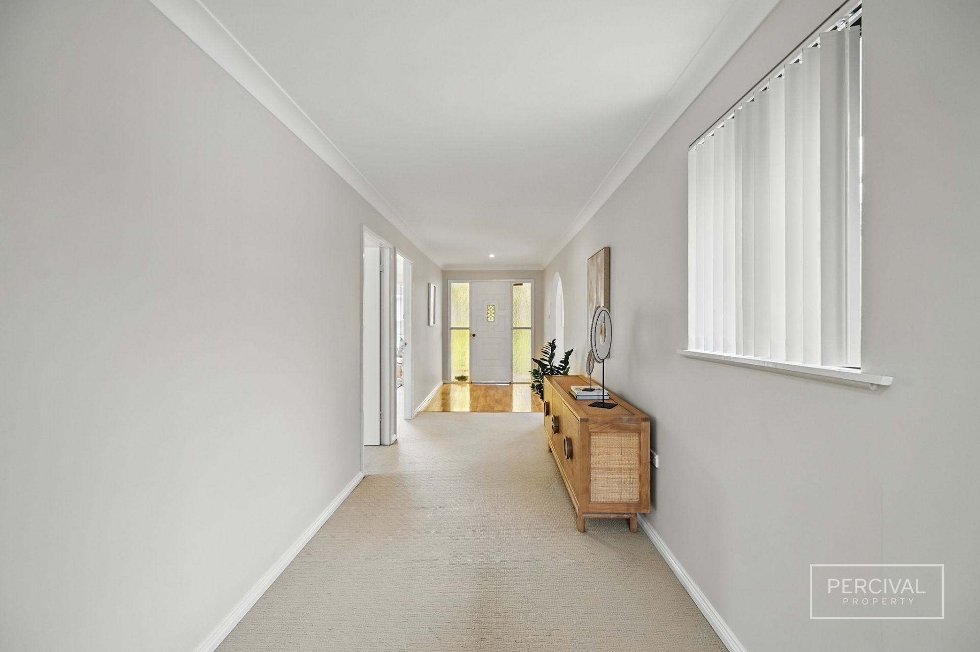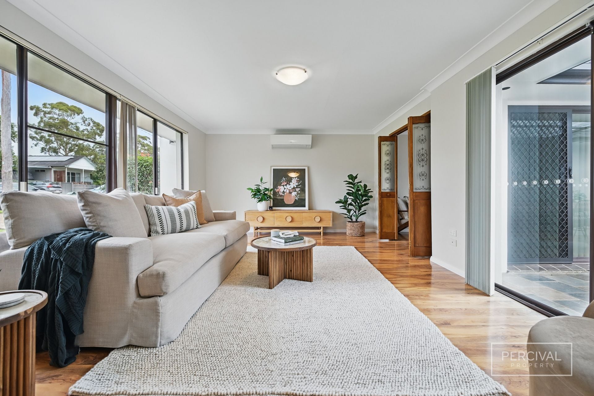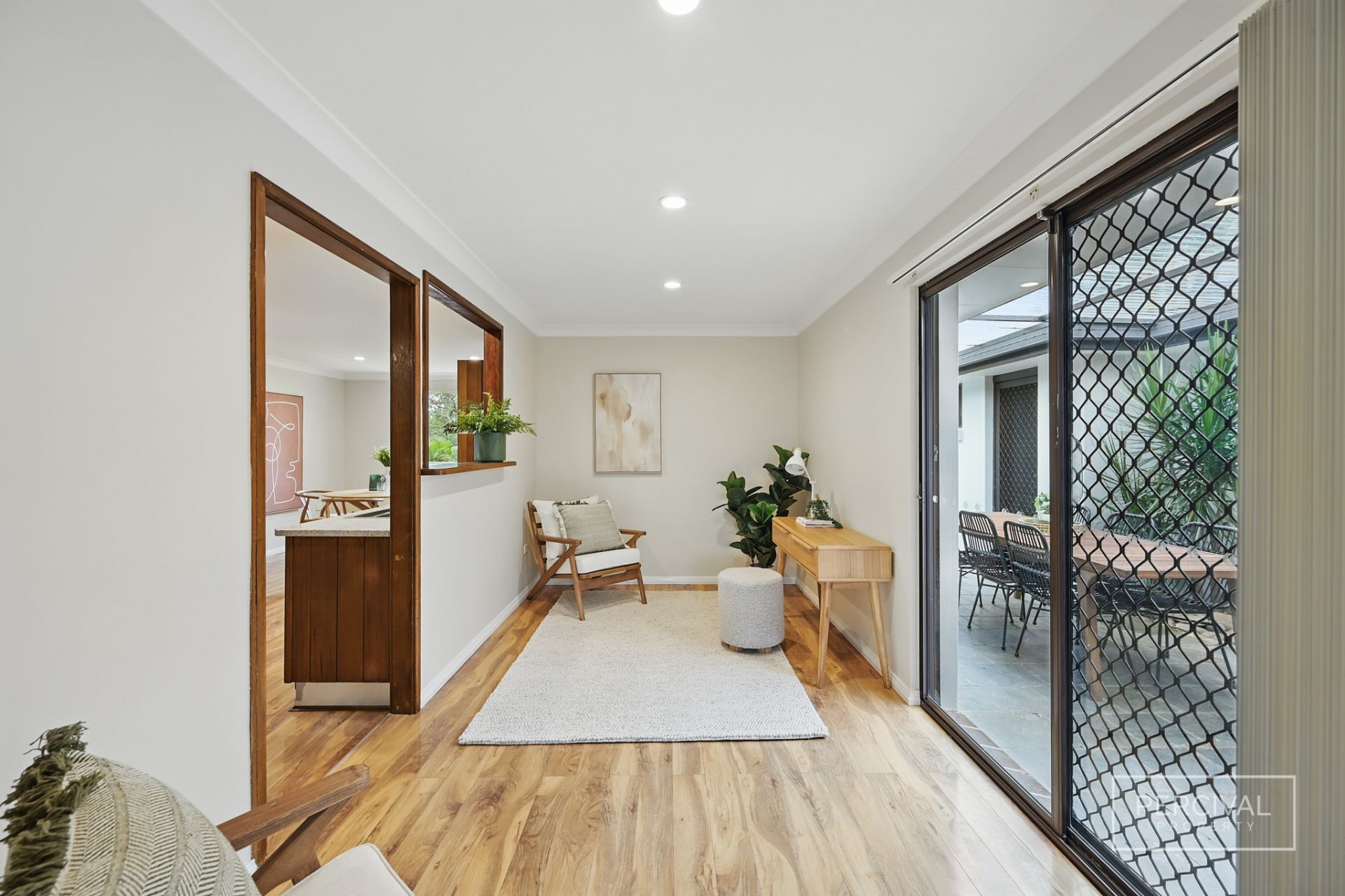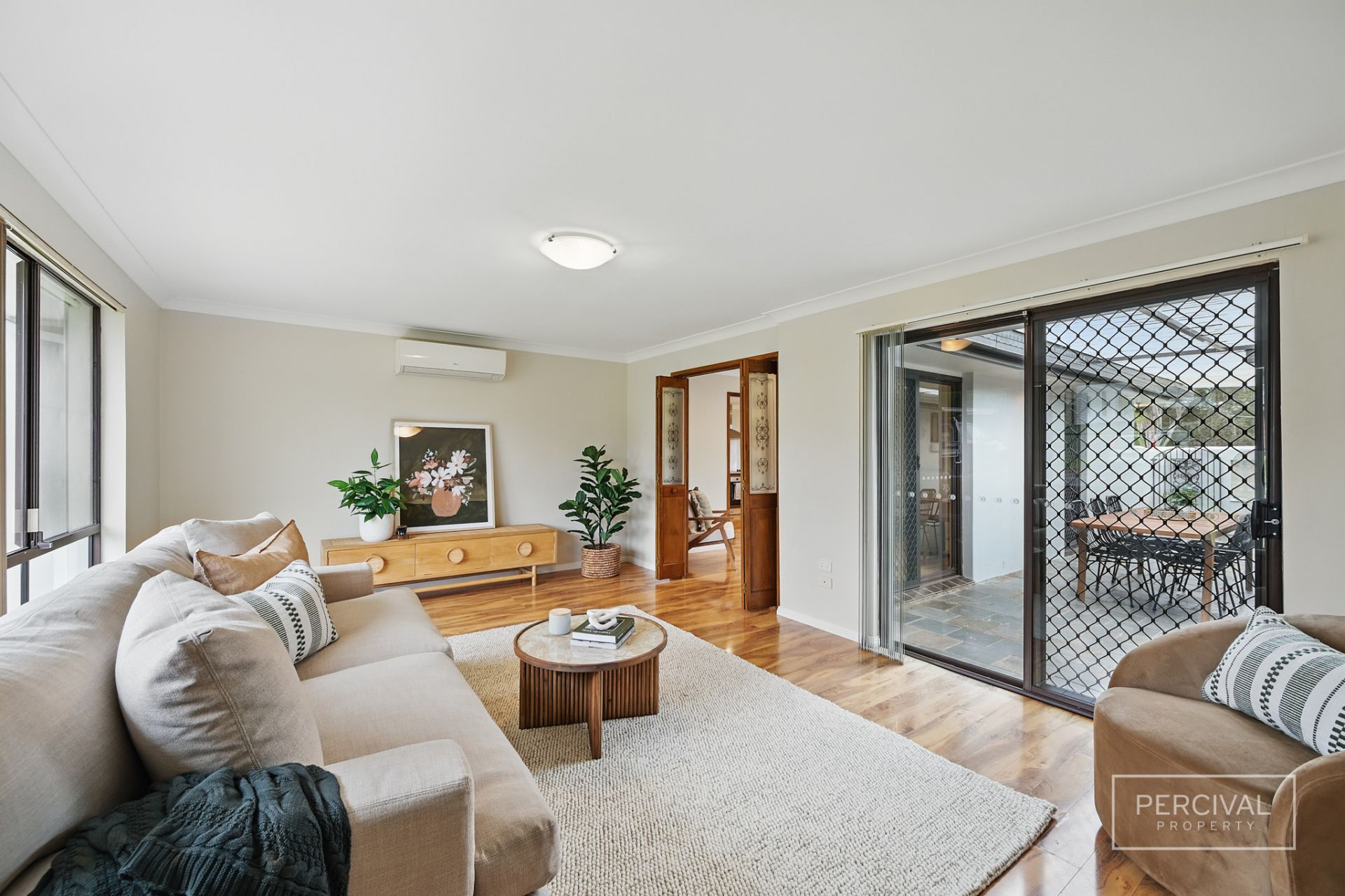 The living zones, finished with timber-look flooring, include a lounge room with reverse cycle air conditioning, a kitchen with timber cabinetry and electric cooking, and an adjoining meals area. A separate formal dining room opens to the covered alfresco space-creating a flexible second living area or a relaxed entertaining zone with excellent indoor-outdoor connection.