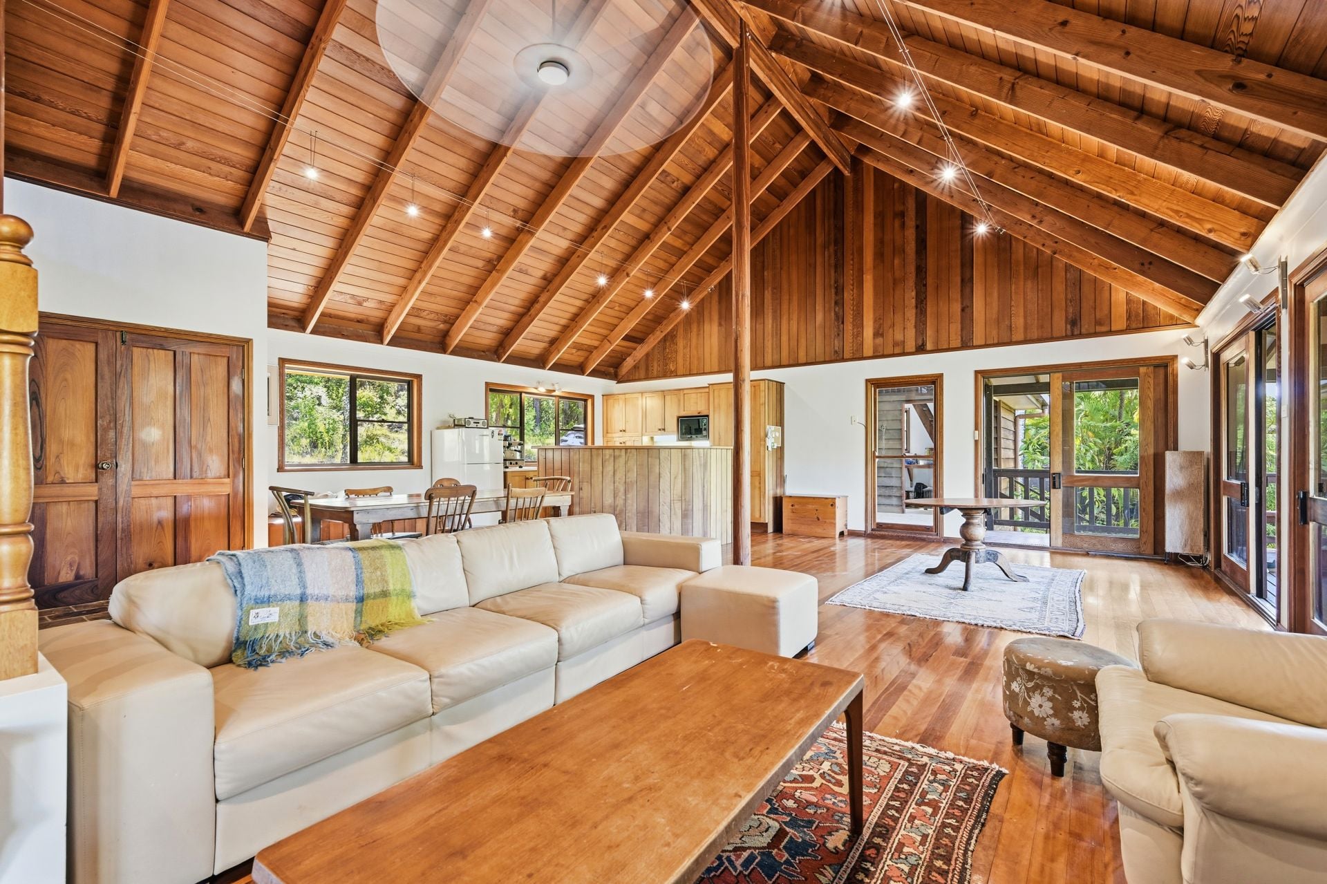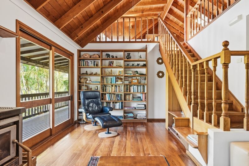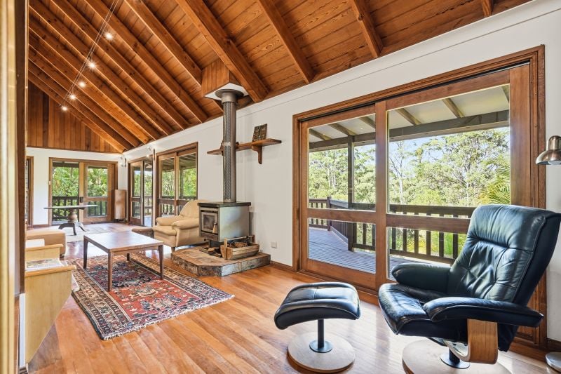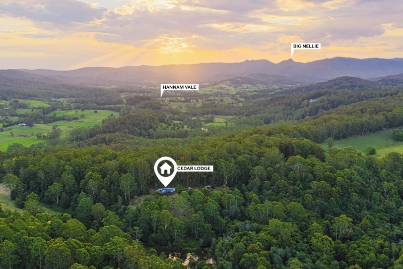 The main residence, 'Cedar Lodge', is a beautifully built two-story home constructed from cedar, hardwood and mahogany. It features a striking cathedral ceiling, timber staircase, expansive open plan living area and wide verandahs overlooking forest, gardens and lawns.