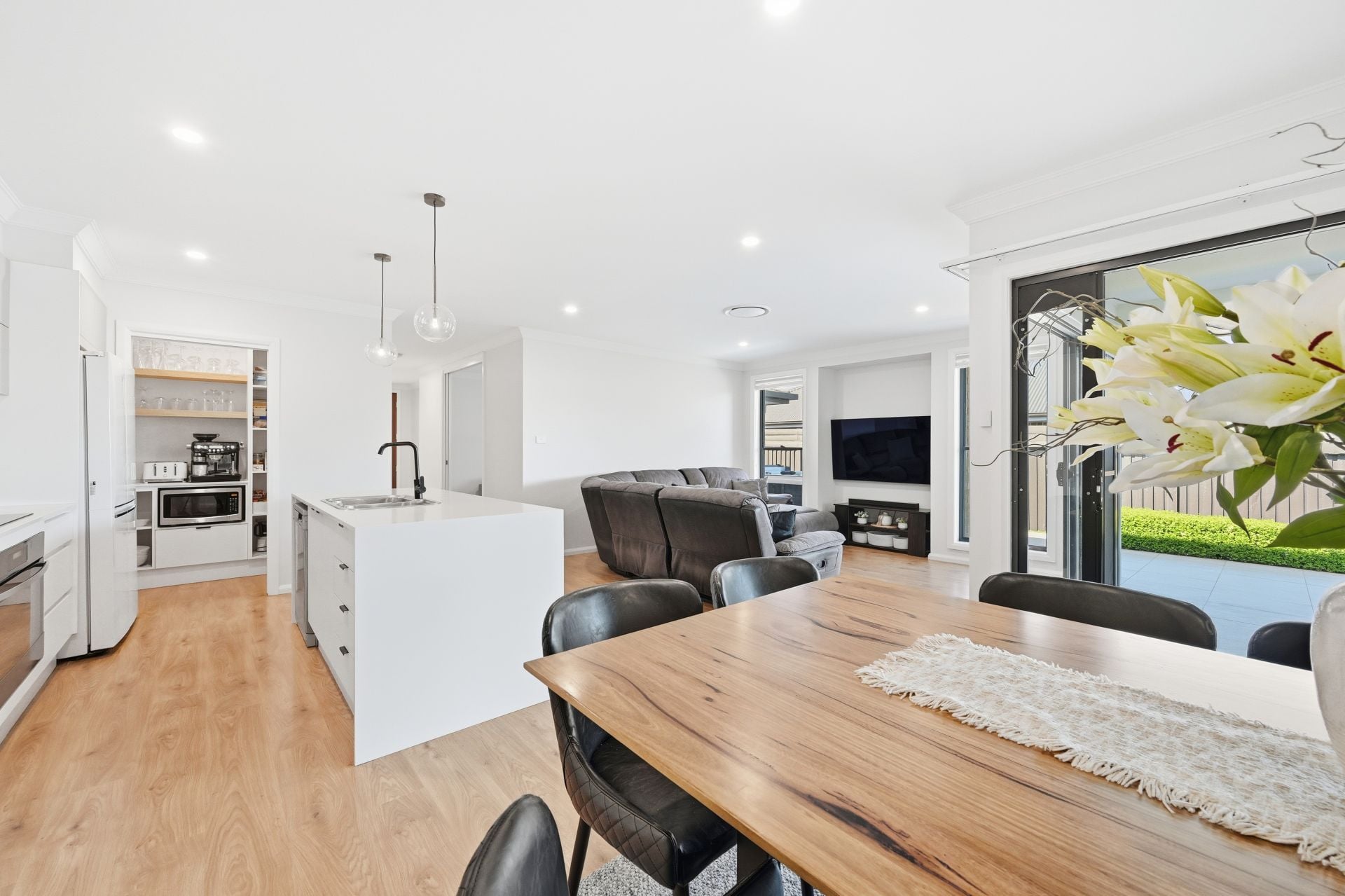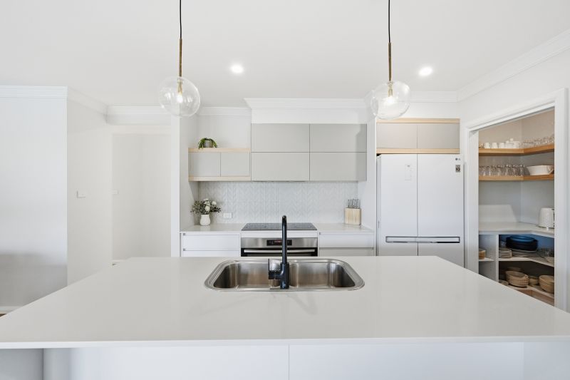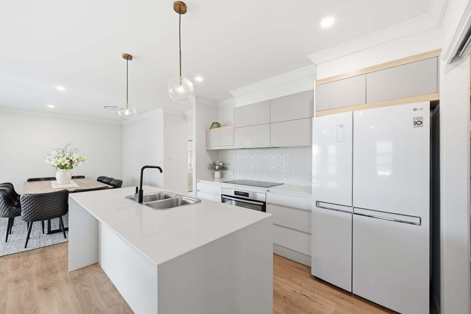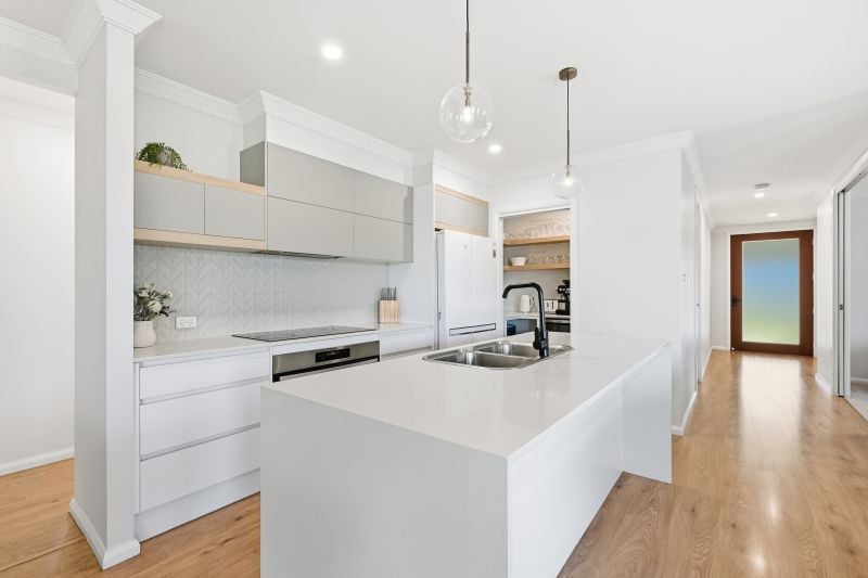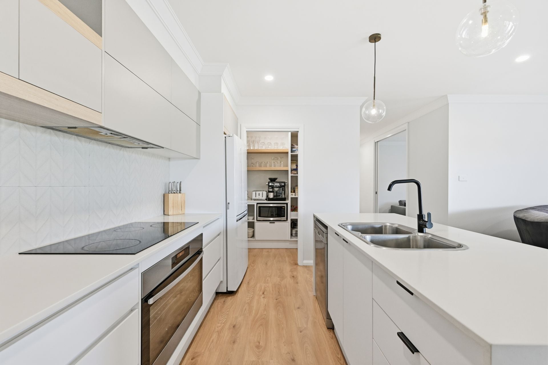 The sleek kitchen has been designed for everyday efficiency and effortless entertaining, with stone benchtops, an island with double sink, electric cooktop, wall oven and crisp cabinetry with soft timber accents. A well-appointed walk-in pantry keeps appliances and provisions neatly tucked away yet within easy reach, leaving the main space beautifully uncluttered.