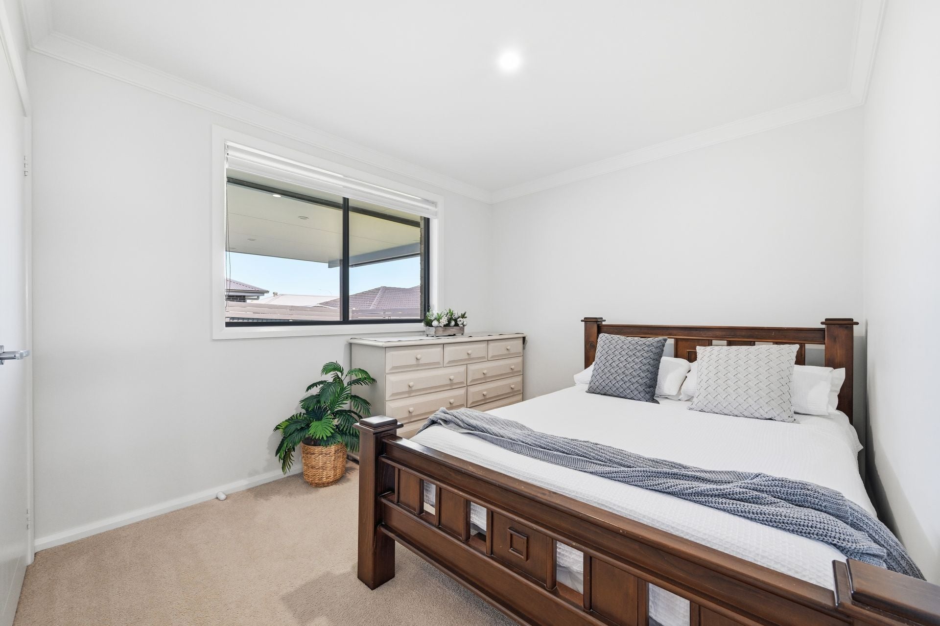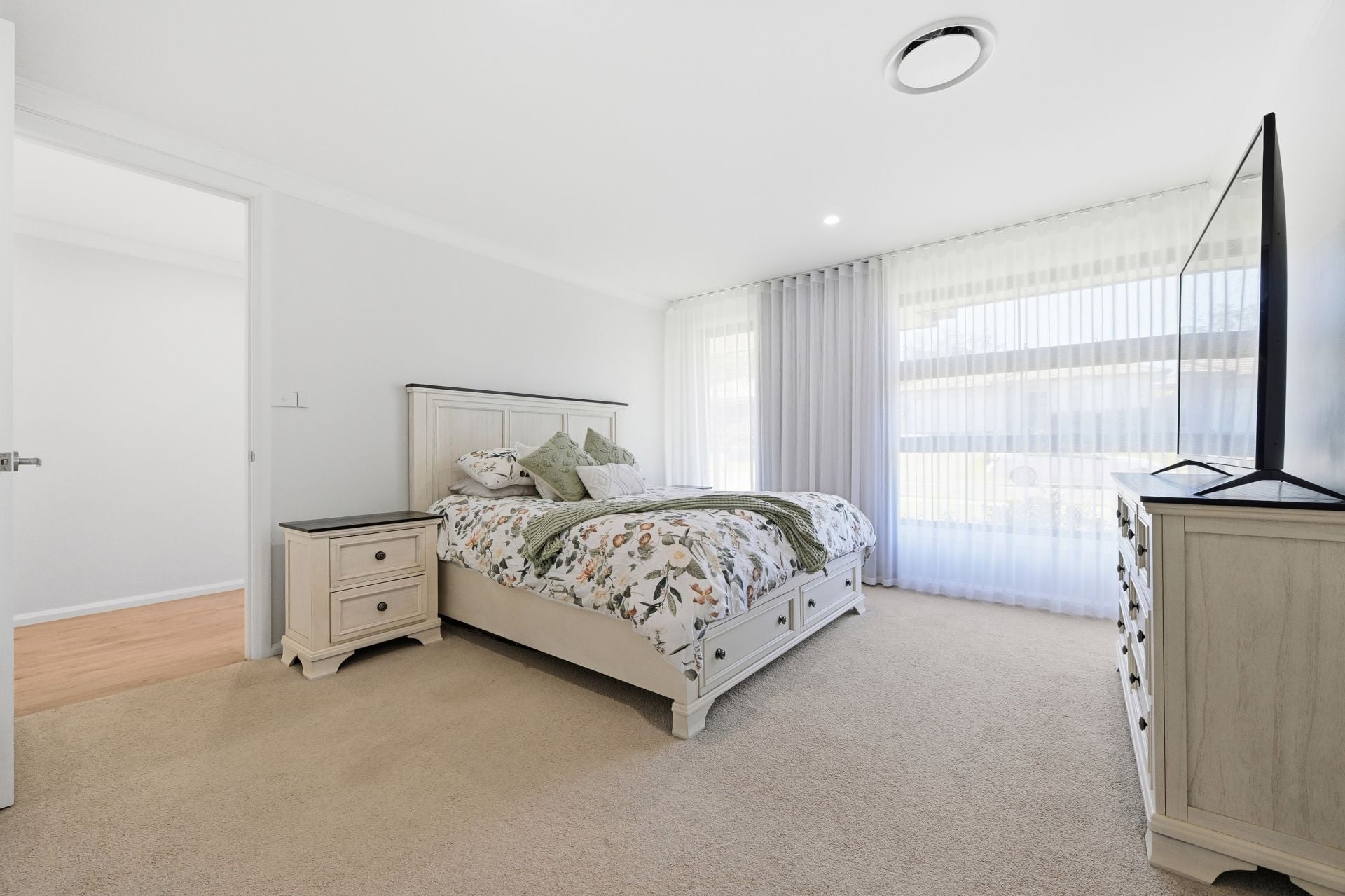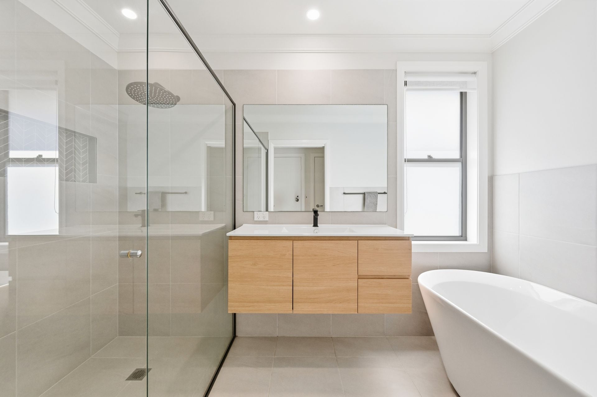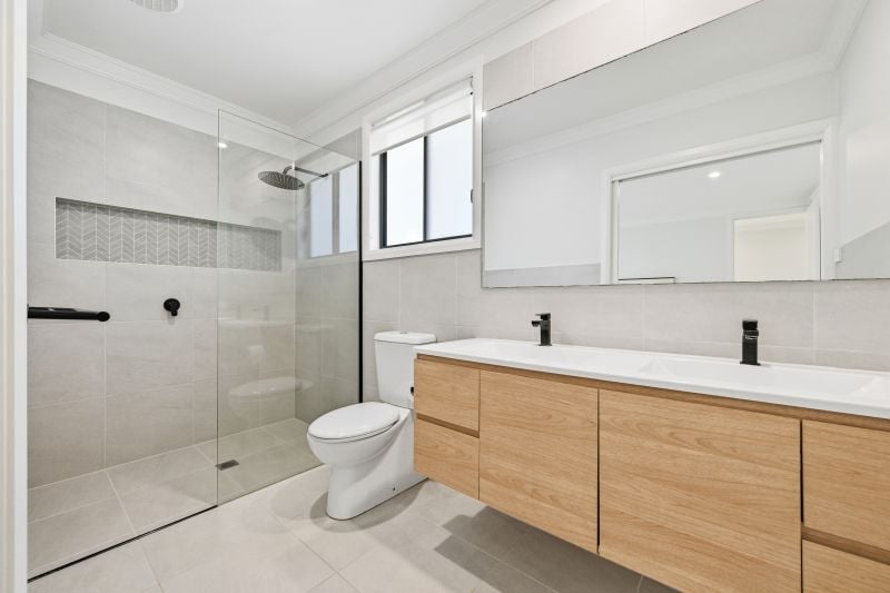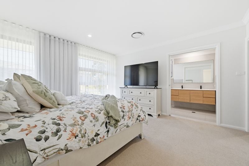Accommodation is thoughtfully placed. The main bedroom enjoys separation at the front of the home and feels like a private suite, complete with walk-in robe and a stylish ensuite finished in a timeless palette. Three additional bedrooms each offer built-in storage and easy access to the family bathroom, where a freestanding tub, frameless glass shower and floating timber-look vanity create a calm, spa-style feel.