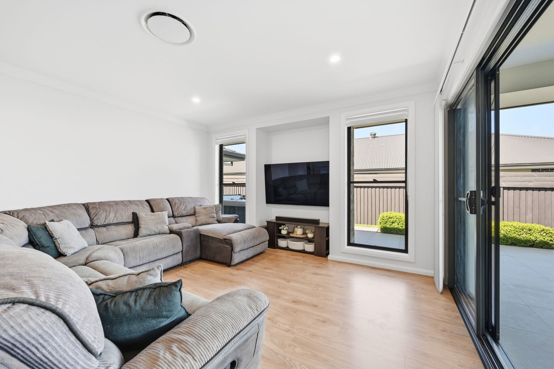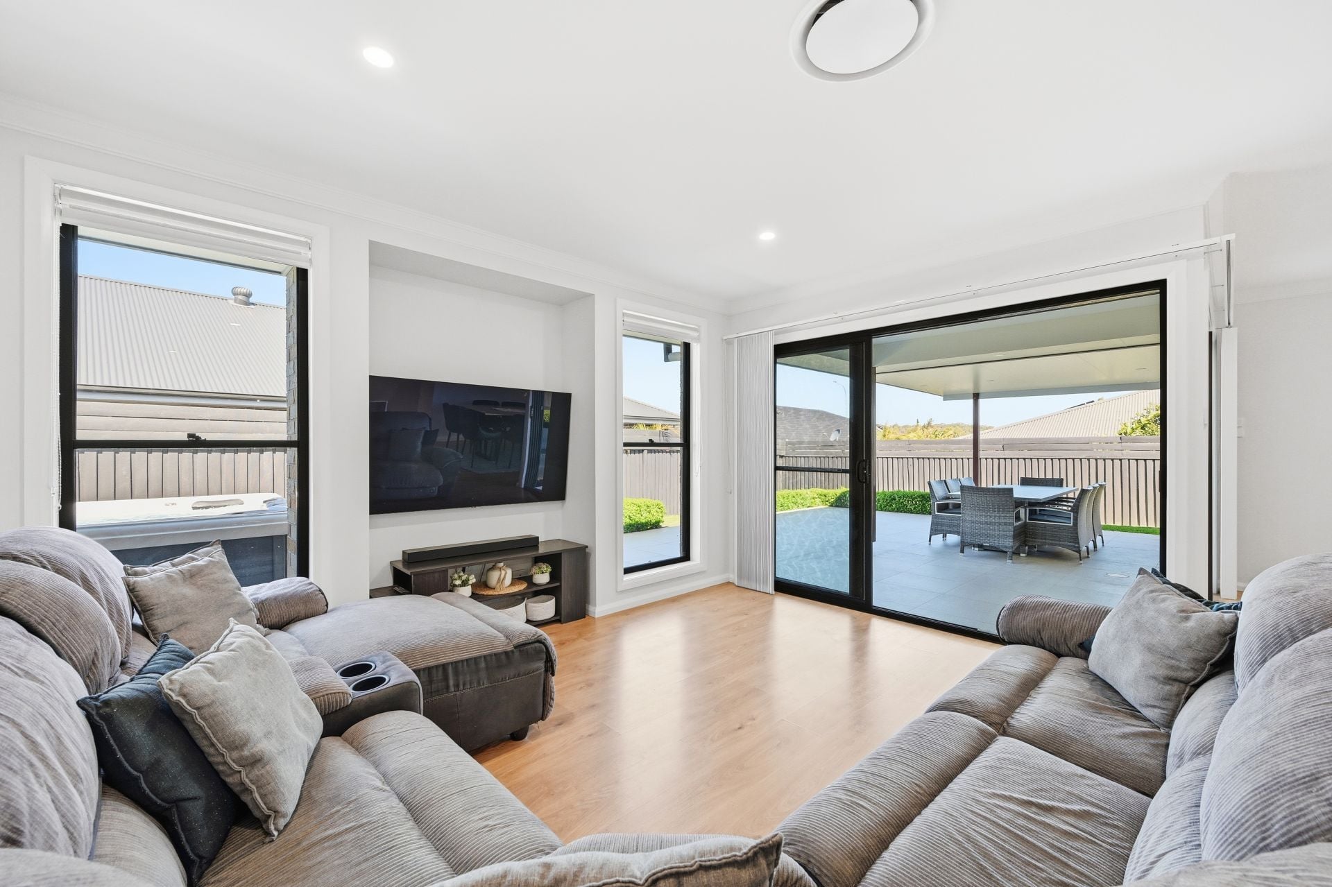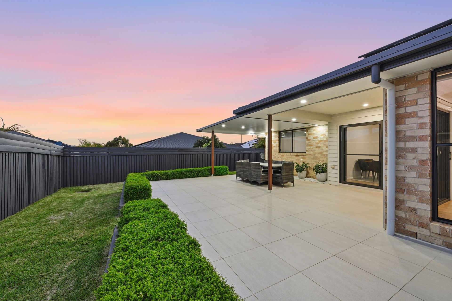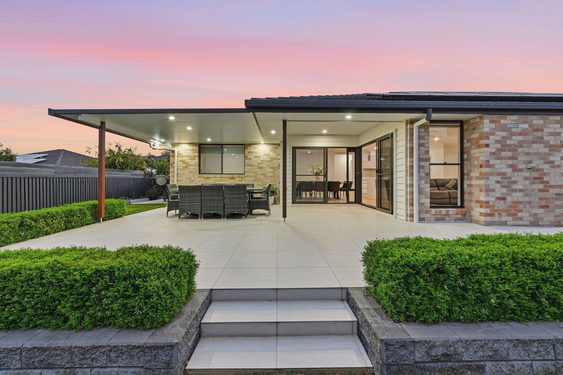 Oversized tiles extend from the under-roof terrace to the surrounding patio, creating a huge, low-maintenance entertaining domain with room for long lunches, children's play and gatherings that move easily between house and garden.