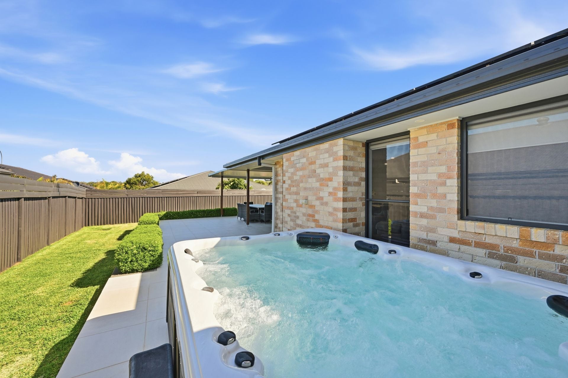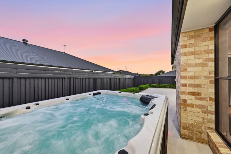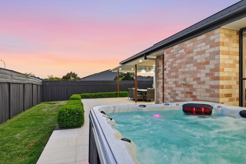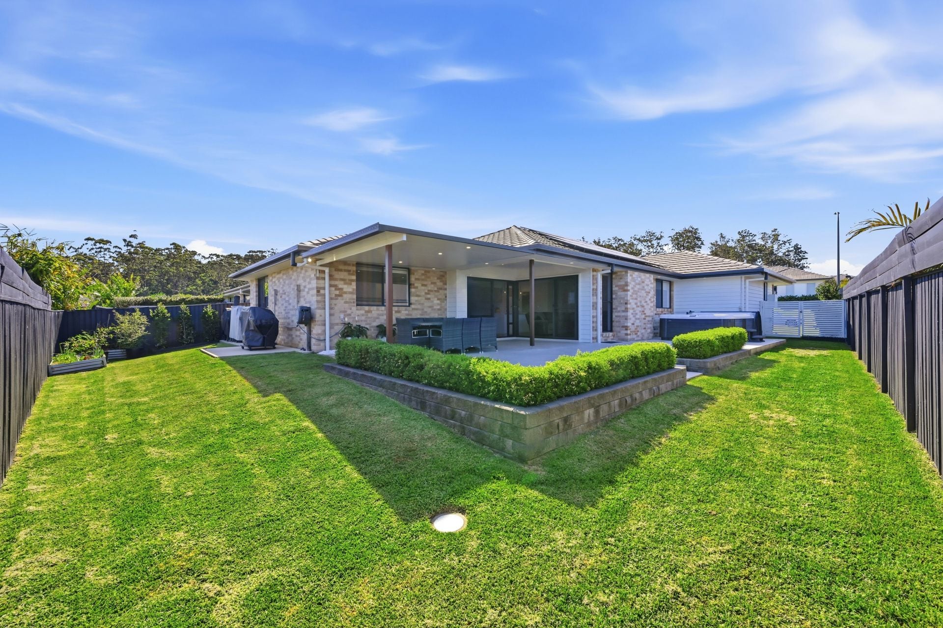 The heated spa is a year-round indulgence, while lawns, hedging and raised garden beds add softness to your green space.