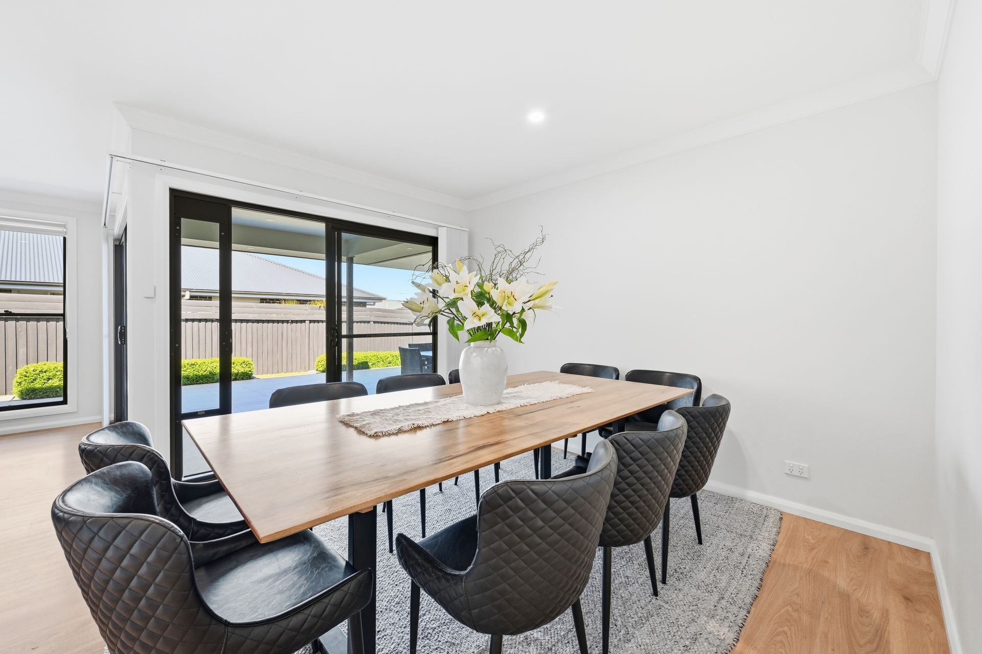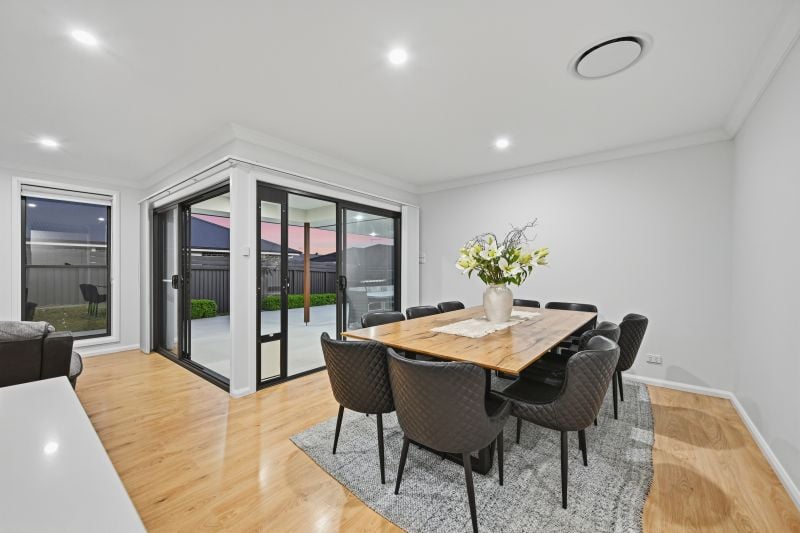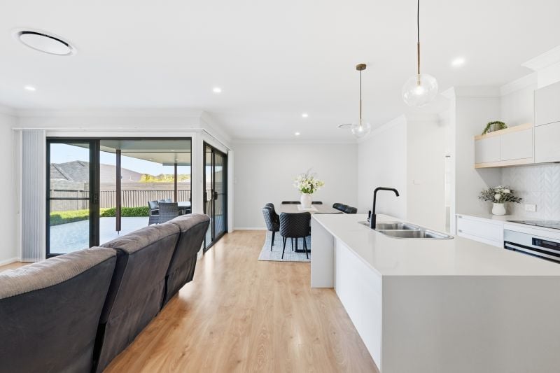 At the heart of the layout is a generous open plan living and dining zone framed by wide glass sliders to an impressive covered alfresco.